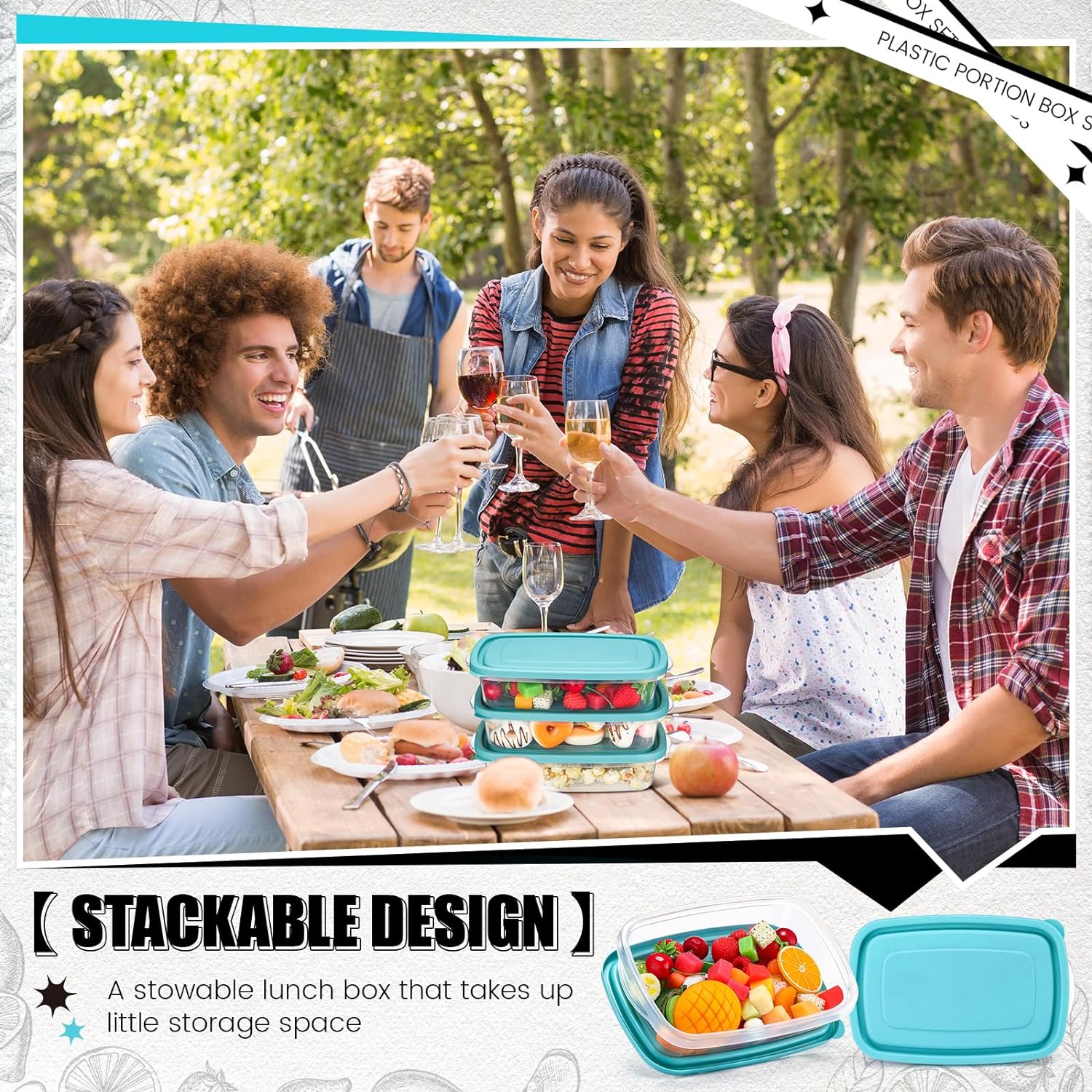 - Stackable Design: these plastic portion box with lids boast a stackable design that saves space in your fridge, freezer or pantry; Organize your meals or ingredients efficiently, enabling you to find exactly what you're looking for, exactly when you need it