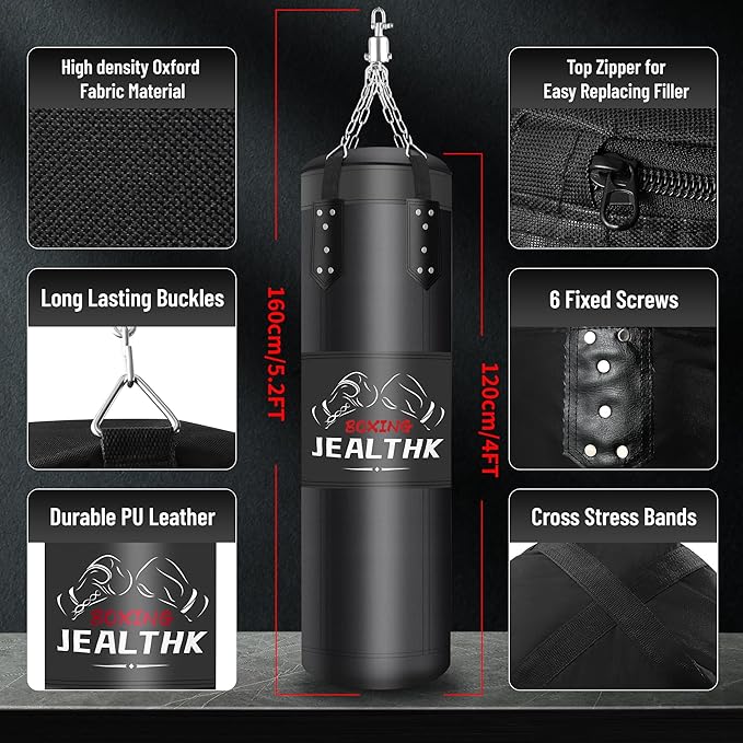 - Professional Boxing Training Equipment Set:A professional set of boxing accessories brings the ultimate experience. they contain 1 x 4ft unfilled punching bag, 1 x 12oz boxing gloves, 1 x steel chain, 1 x connecting carabiner, 1 x boxing bag hanger, 1 x jumping rope, 2x180'' Hand Wraps, 1 x counting grip strength trainer,1 x reflex ball set .4 Expansion Bolts.1 Gift Package.