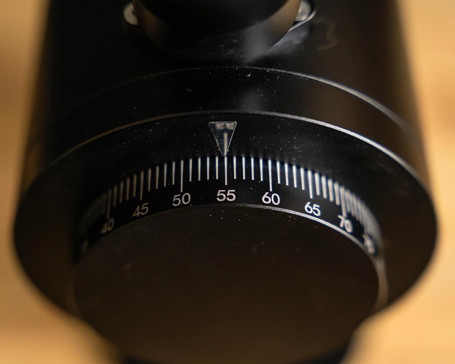 - 【Stepless Adjustment】Redesigned dial is wrapped with chrome. The included metal indicator makes grind size so much easy to adjust. The adjustment is stepless. It can be dialed in for espresso with high precision.