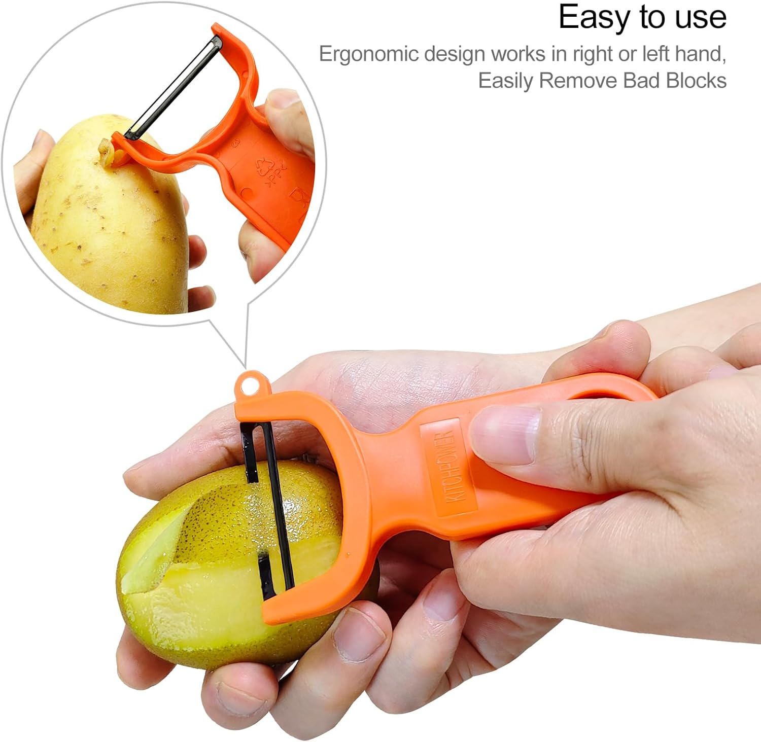 - ERGONOMIC & SCIENTIFIC DESIGN - Ergonomic design works in right or left hand and maintains a firm grip and pressure to ensure peeling is effortless and safe. Handle is comfortable even during repetitive action peeling. You can easily remove bad piece on potato with convenient potato eye remover design.