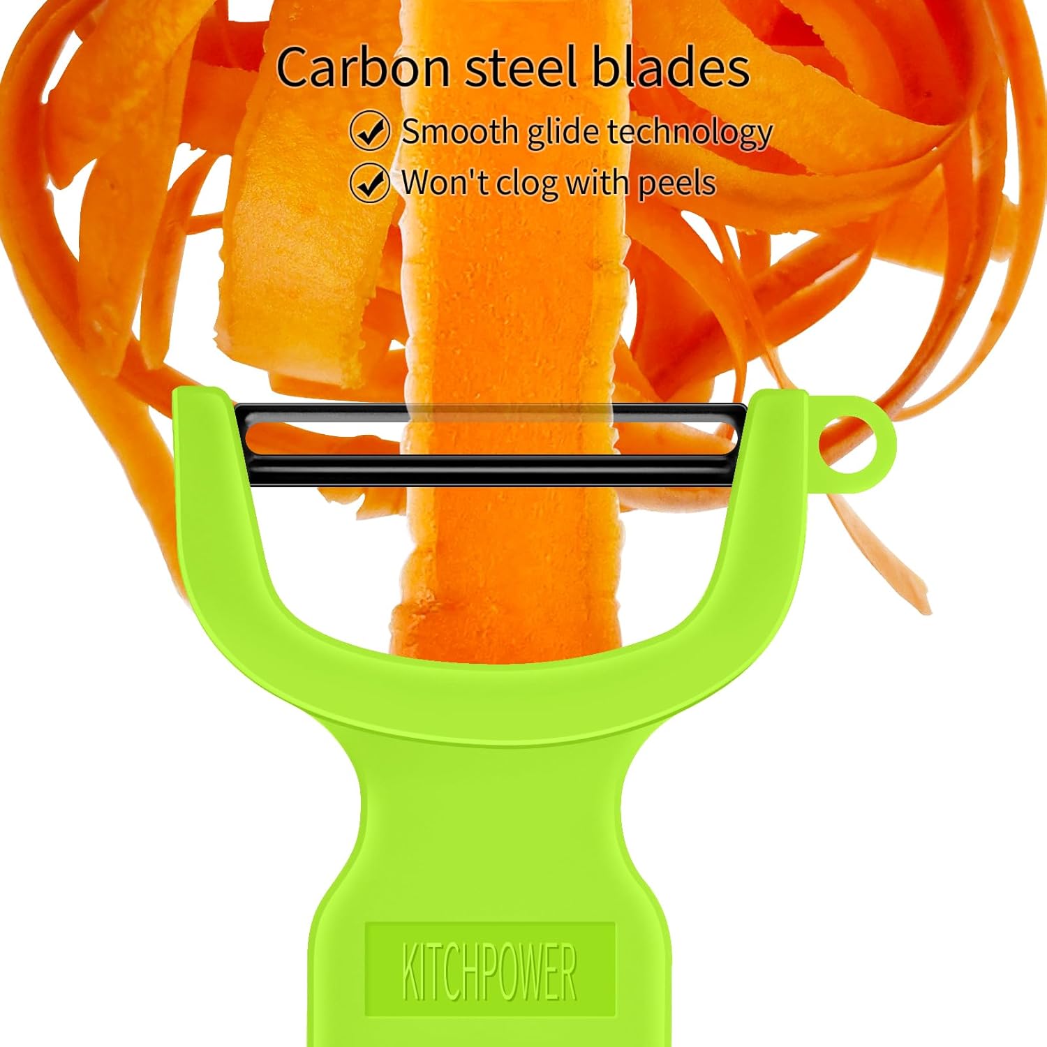 - KITCHPOWER PEELER - Removes just the peel without digging into fruit beneath. Whatever the task, the peeler should handle bumps and curves with ease and without clogging or losing its edge.