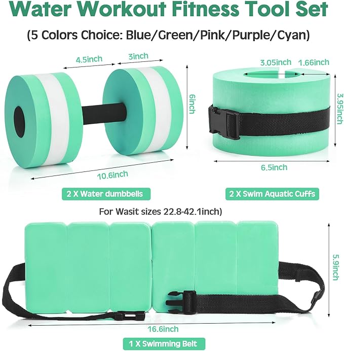 - Complete Package for Water Fitness: this water dumbbell set is a comprehensive package for your water workout regime, including 2 foam swim aquatic cuffs, 2 lightweight aquatic exercise dumbbells, and 1 swim belt, which ensures a full body workout, improving your overall fitness
