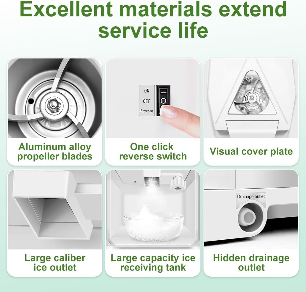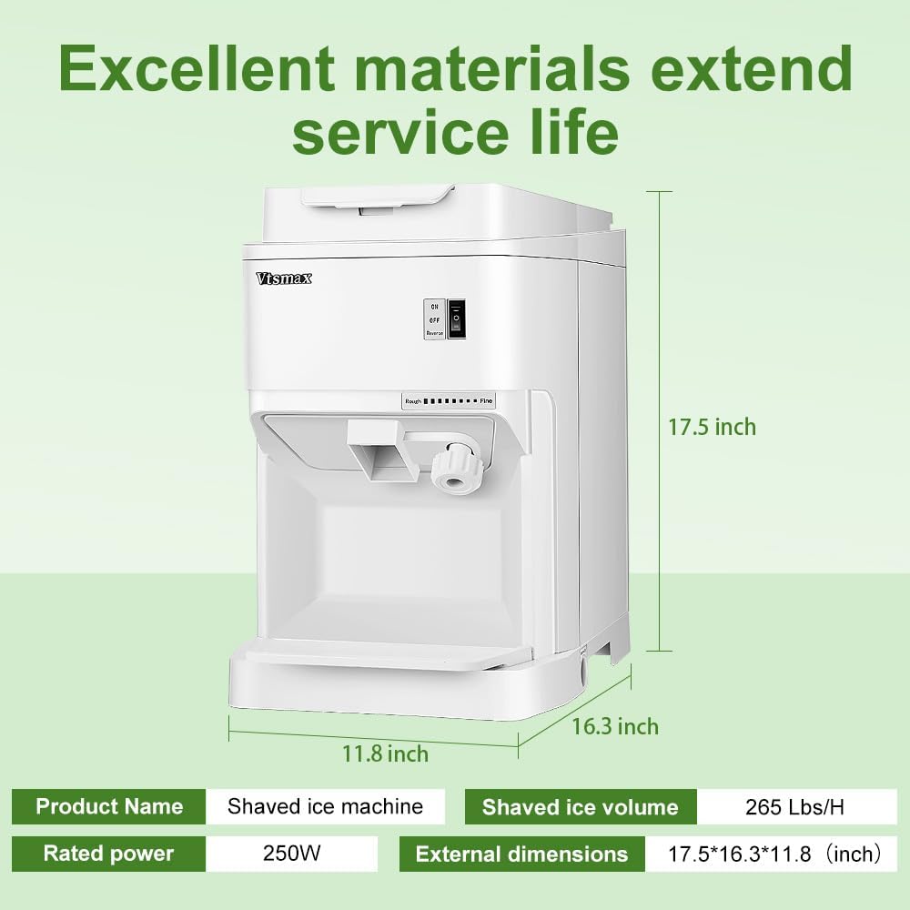 - 【More Efficient】: Equipped with 250W, high-speed efficient motor and a large ice drawer, Vtsmax ice crusher runs at a speed of 320RPM per minute,and will shave over 265lbs of ice per hour. Provids a large amount of ice and greatly improves work efficiency for domestic and commercial use.At the same time, we also provide ice shovel*1 and water outlet pipe*1 for your convenience.