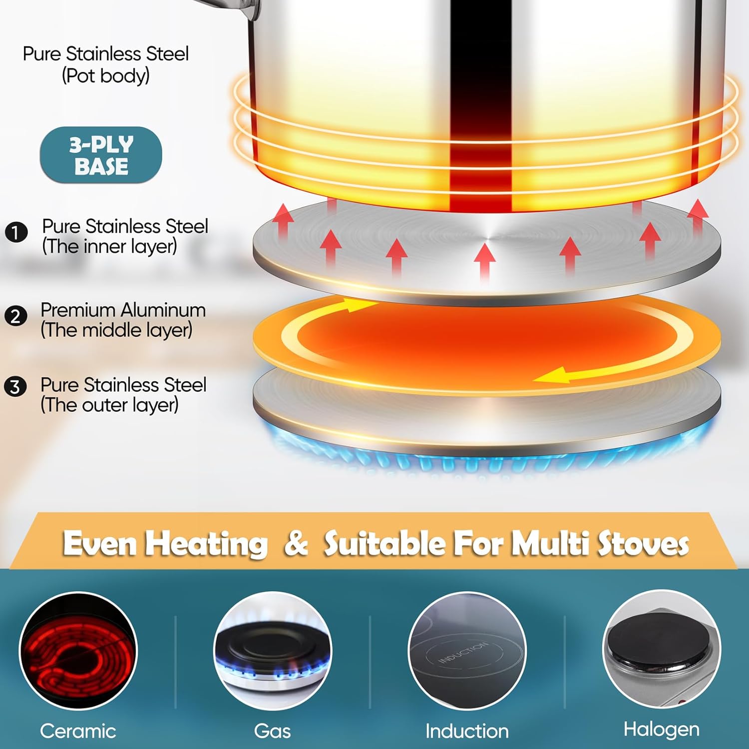 - 【Tri-ply Base for Multi Stoves】The small pot bottom with 3-Ply constructions, Pure stainless steel of outer and inner layers for rust-proof and longtime use, Core aluminium is to conduct heat faster and more even (this layer will not contact your food ), And straight side helps to increase the bottom area which is equal to heating surface, To reduce your cooking time and save energy, Making your pan work with many stovetops effectively, such as induction, gas, electric and ceramic stove etc, Say goodbye to the limitations of traditional pan