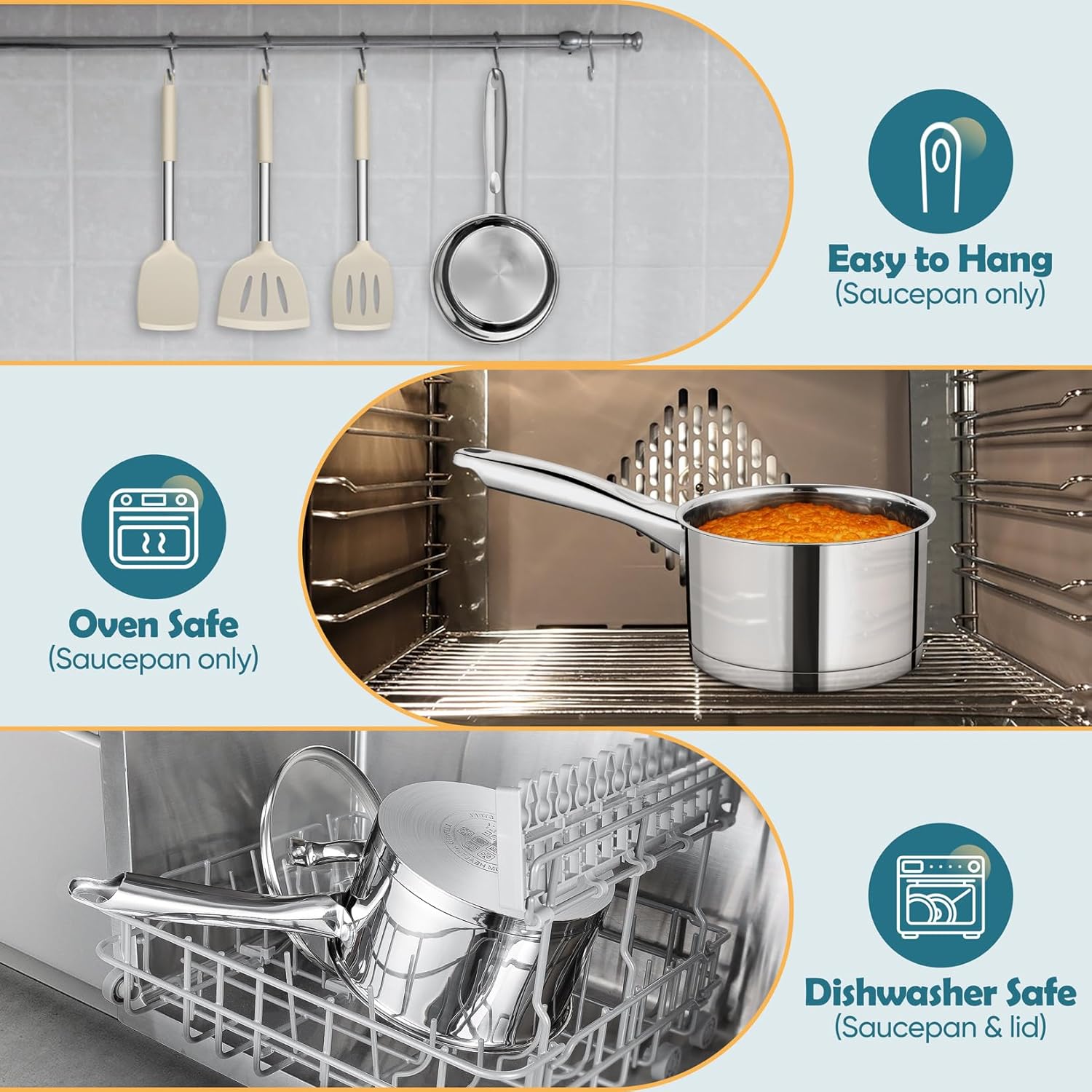 - 【Easily Clean & Save Space】Our sauce pan and lid is basically no cleaning dead corner, Overall mirror polished surface helps to reduce the risks of food sticking effectively, Making it clean easily by hand, Always keep shiny after taking out from dishwasher, To save your precious time and labor, Making cleanup hassle-free after cooking, A big hole on the handle end make you can hang up pot easily on the hook, Saving space and maintaining tidiness of your kitchen
