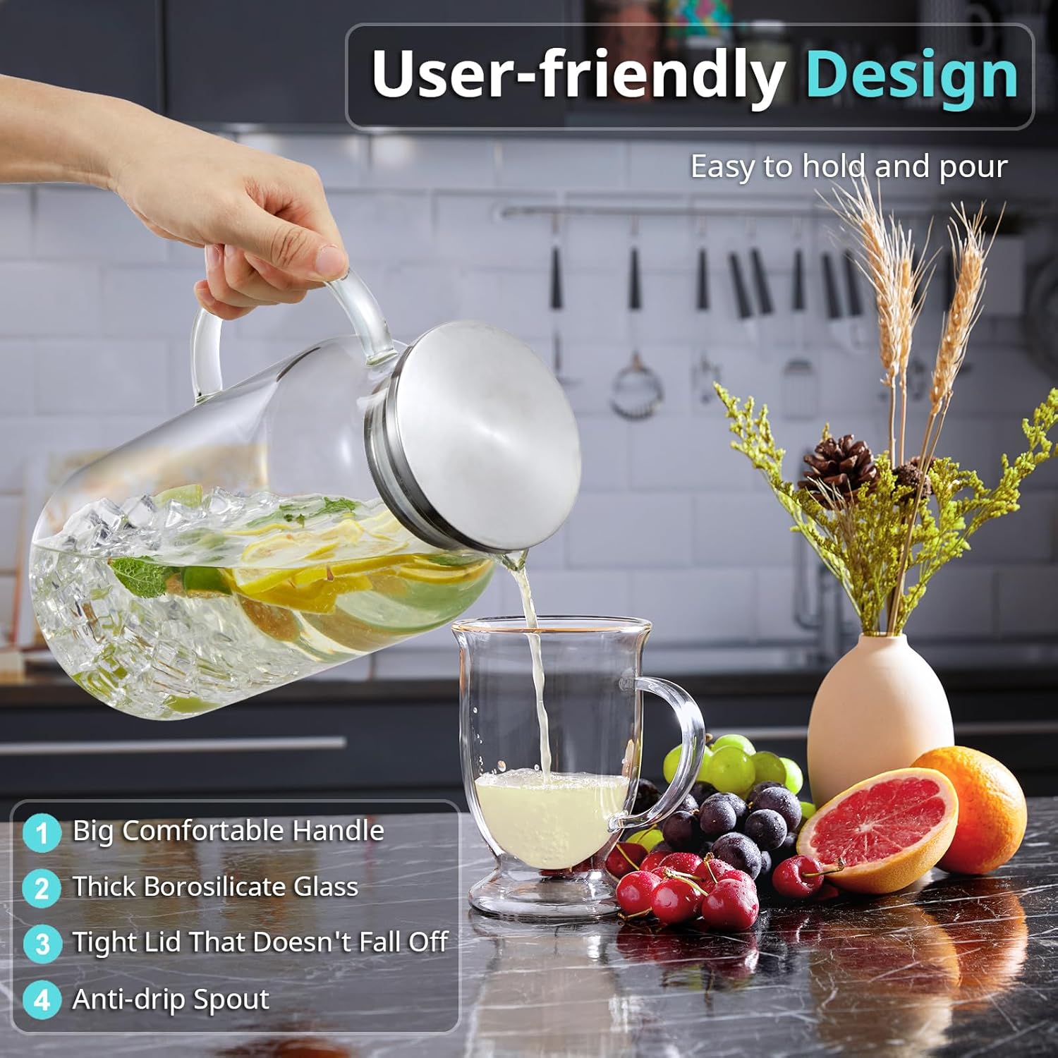 - Large Capacity for Versatile Use: The glass pitcher holds 1 gallon or 128 oz, which is exceptionally practical and versatile for parties or everyday use. Perfect for water, milk, iced tea, homemade lemonade or juice, sangria, coffee, wine and so on.