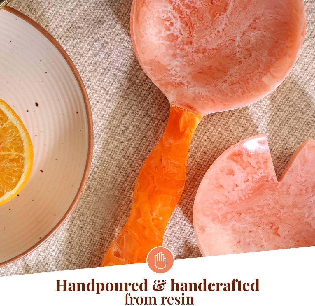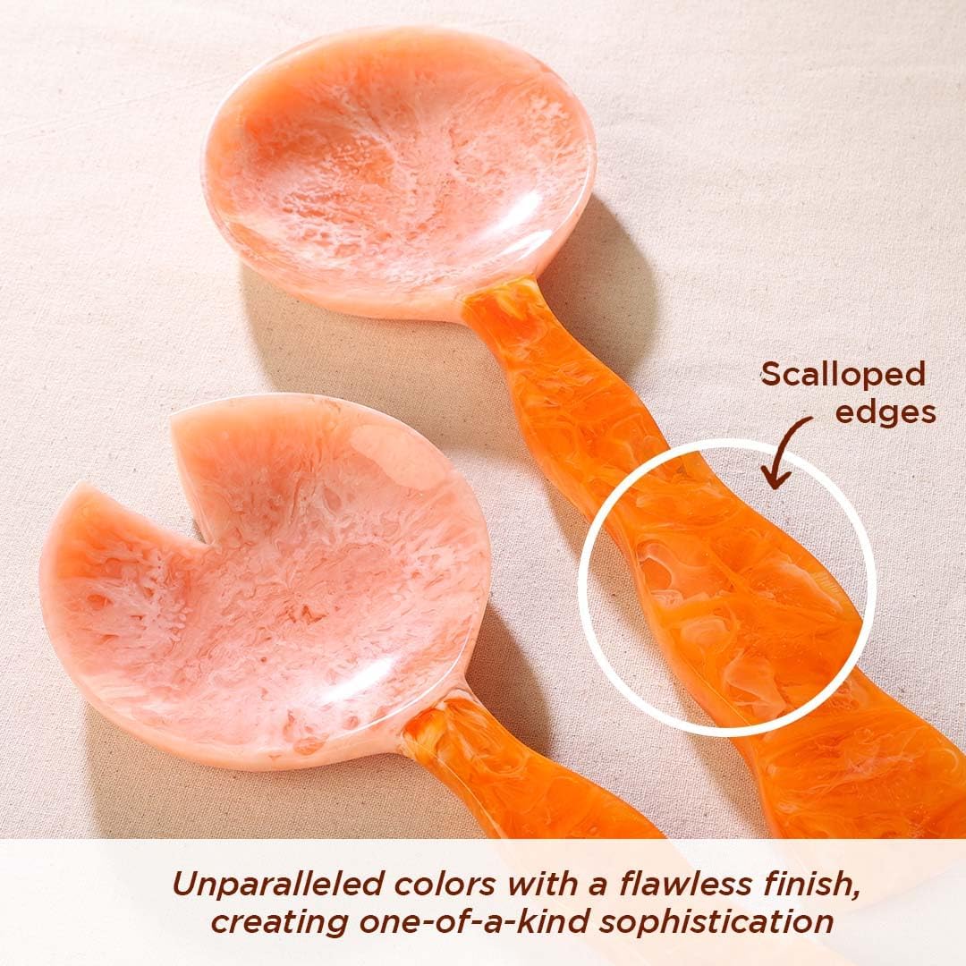 - [HANDCRAFTED FROM RESIN] - Our spatula tongs sets feature elegant scalloped edges and a sleek, modern look that enhances any kitchen, salad bowl or dining decor. Each set in the aesthetic kitchen essentials is uniquely crafted, showcasing distinct patterns and characteristics, ensuring a one-of-a-kind piece. The best orange kitchen decor addition to kitchen fall decor this autumn.