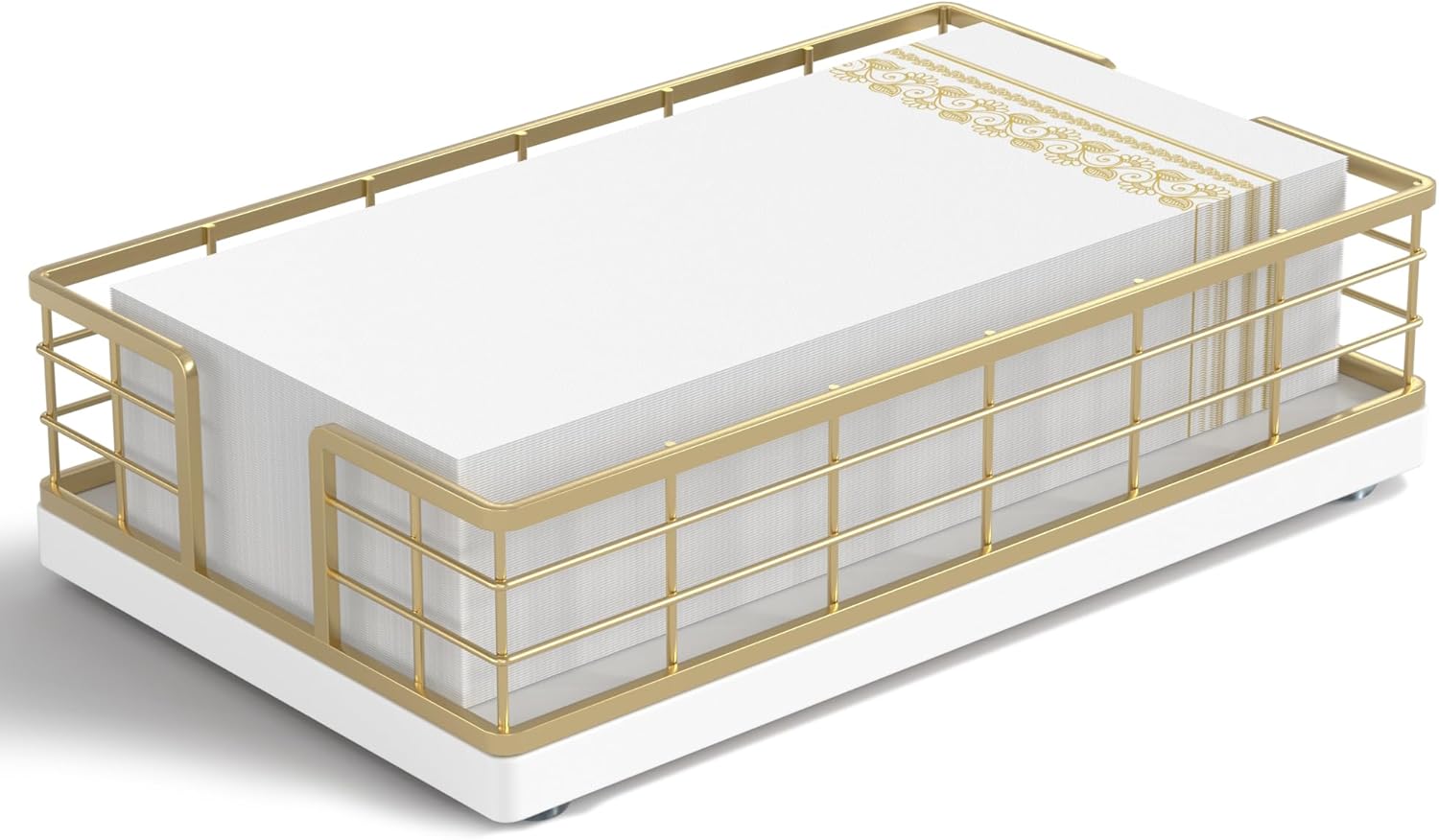 Wican Guest Towel Holder Tray for Bathroom, Oak and Iron Napkins Holder for Powder Room Dinning Table Wooden Basket for Disposable Paper Hand Towels Gold and White