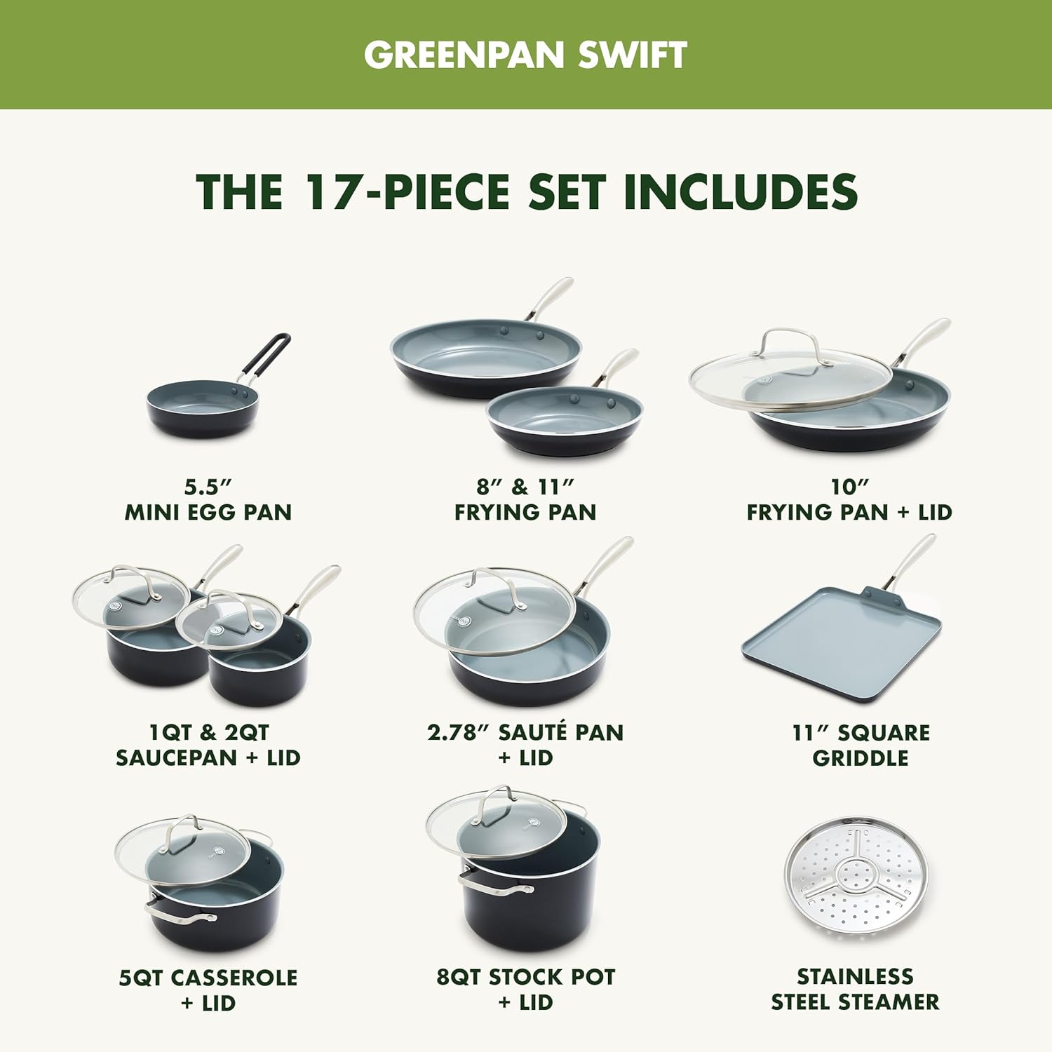 GreenPan 17 Piece Nonstick Swift Cookware Set, Ceramic PFAS-Free Pots & Pans with Lids, Dishwasher & Oven/Broiler Safe to 600F, Kitchen Cooking Set, Sauce, Saute, Stock, Griddle, Frying Pans, Gray