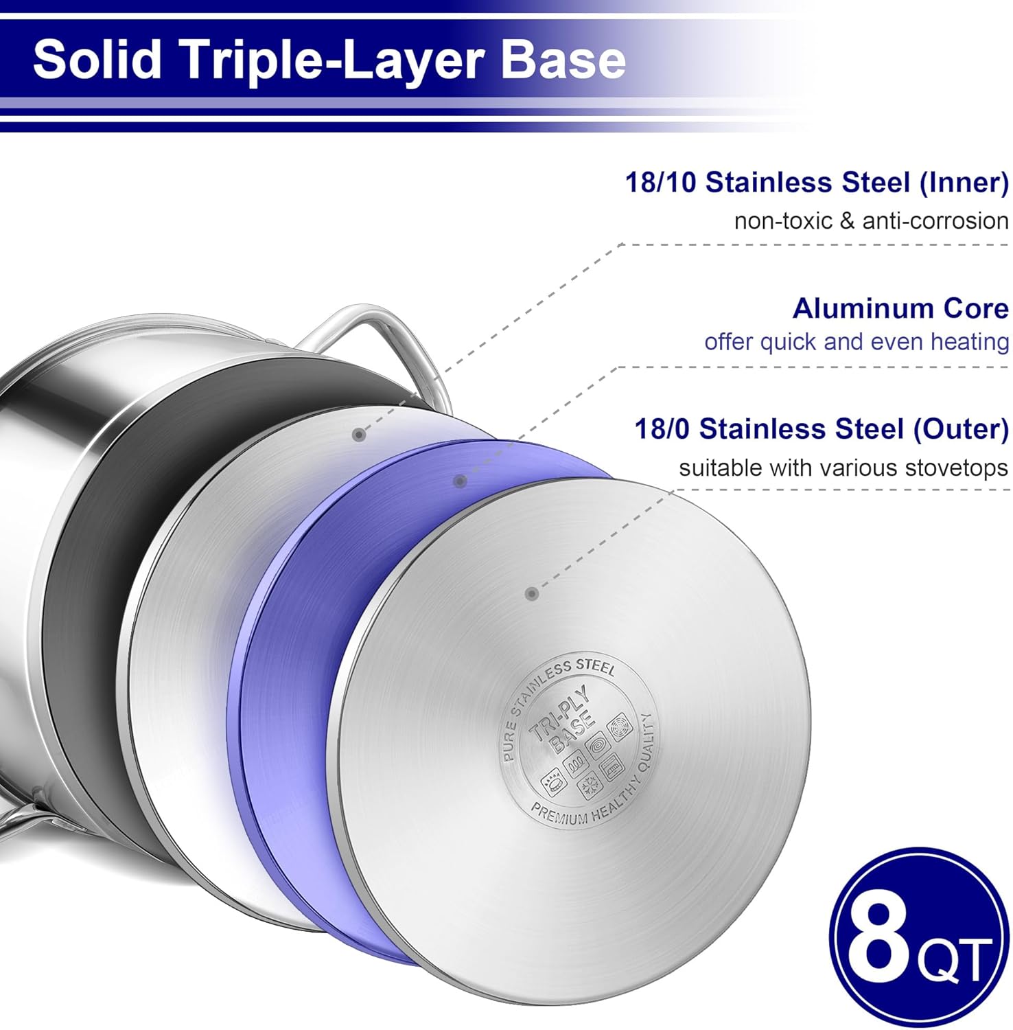 - Premium Stainless Steel: tri-ply base of stock pot is crafted from 18/10 stainless steel inner, aluminum internal core and magnetic 18/0 stainless steel outer, food-grade and nickel-free material without any harmful chemical substance, won’t react with foods in cooking, ensuring your daily cooking is safe and healthy, solid stainless steel resists corrosion and oxidation, not easy to deform, durable and solid enough for long time use