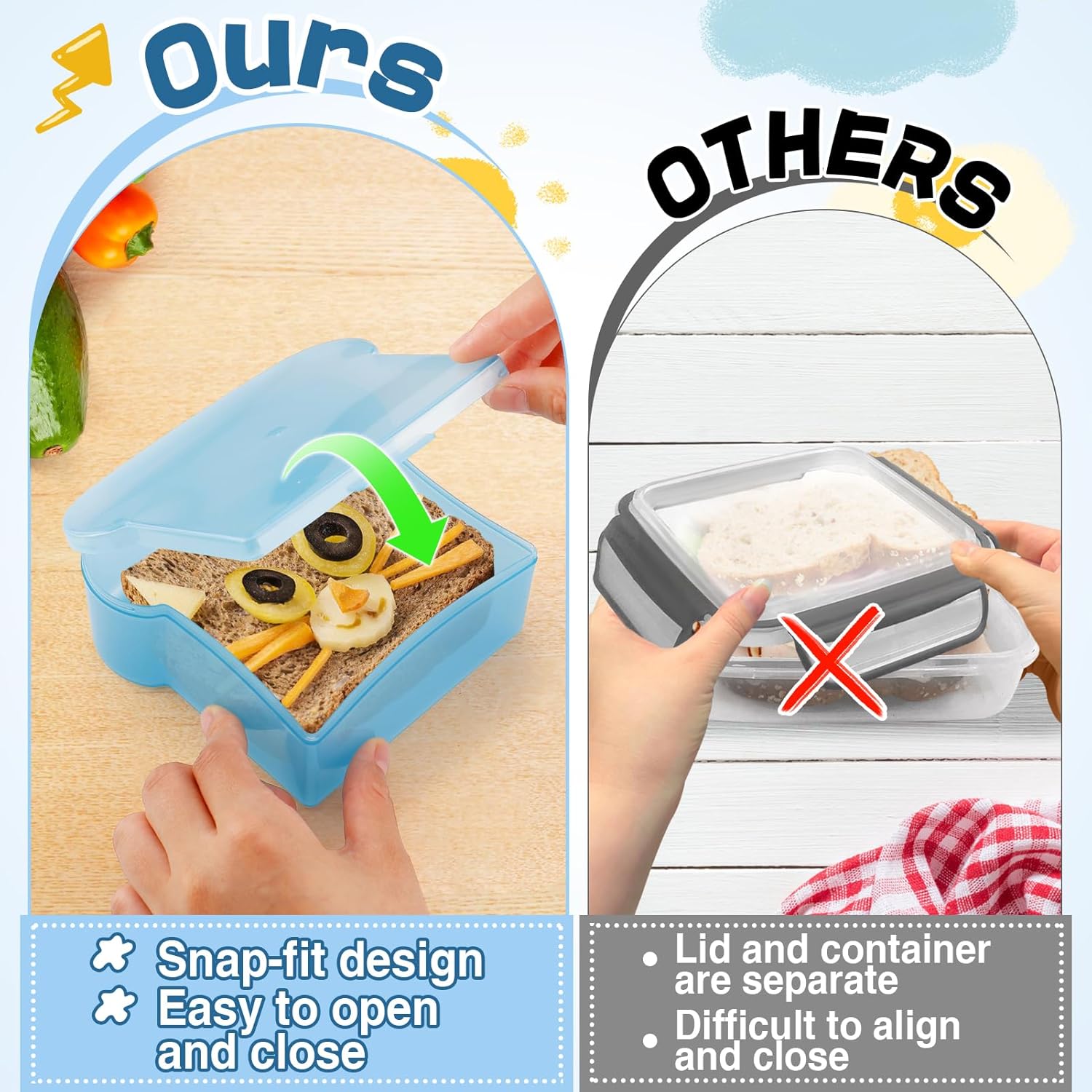 - Convenient Design: The sandwich containers for lunch boxes have a simple snap-on lid for easy opening and closing. Our sandwich box can also be heated in the microwave, so you can quickly eat a hot lunch.