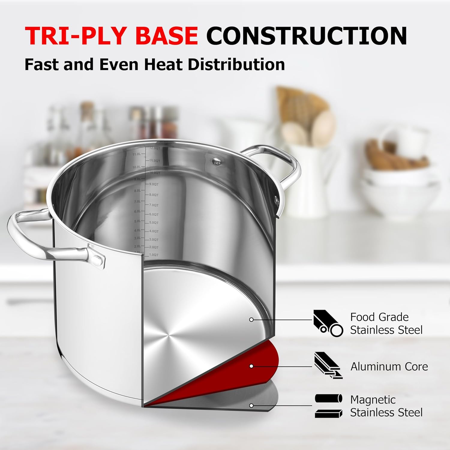 - Tri-ply Based Construction, the bottom of cooking pot consists of 3 layers. The inner layer is food grade stainless steel, it’s safe to contain food; the outer layer is magnetic stainless steel that decides this stockpot can be compatible with induction cooker, gas, electric, halogen, ceramic and oven. Between them, the impact-bonding aluminum core facilitates the soup pot a fast and even heat distribution and good heat conduction