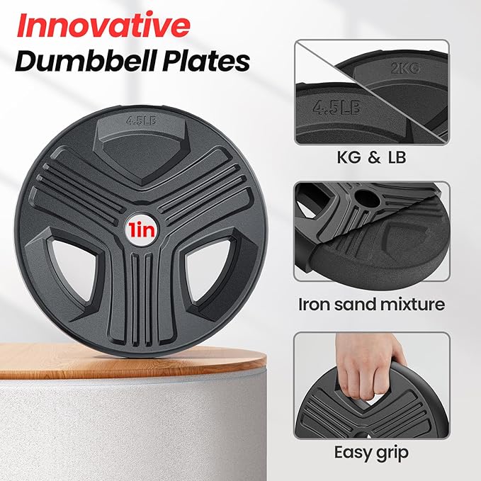 - 【Innovative Dumbbell Plates】Innovative dumbbell plates feature dual KG & LB units, eliminating the hassle of weight conversion. Constructed from high-quality PE, these plates absorb shock and protect floors. Deep grooves ensure easy grip. The rust-free and odor-free interior is made from a mix of cement and iron sand.