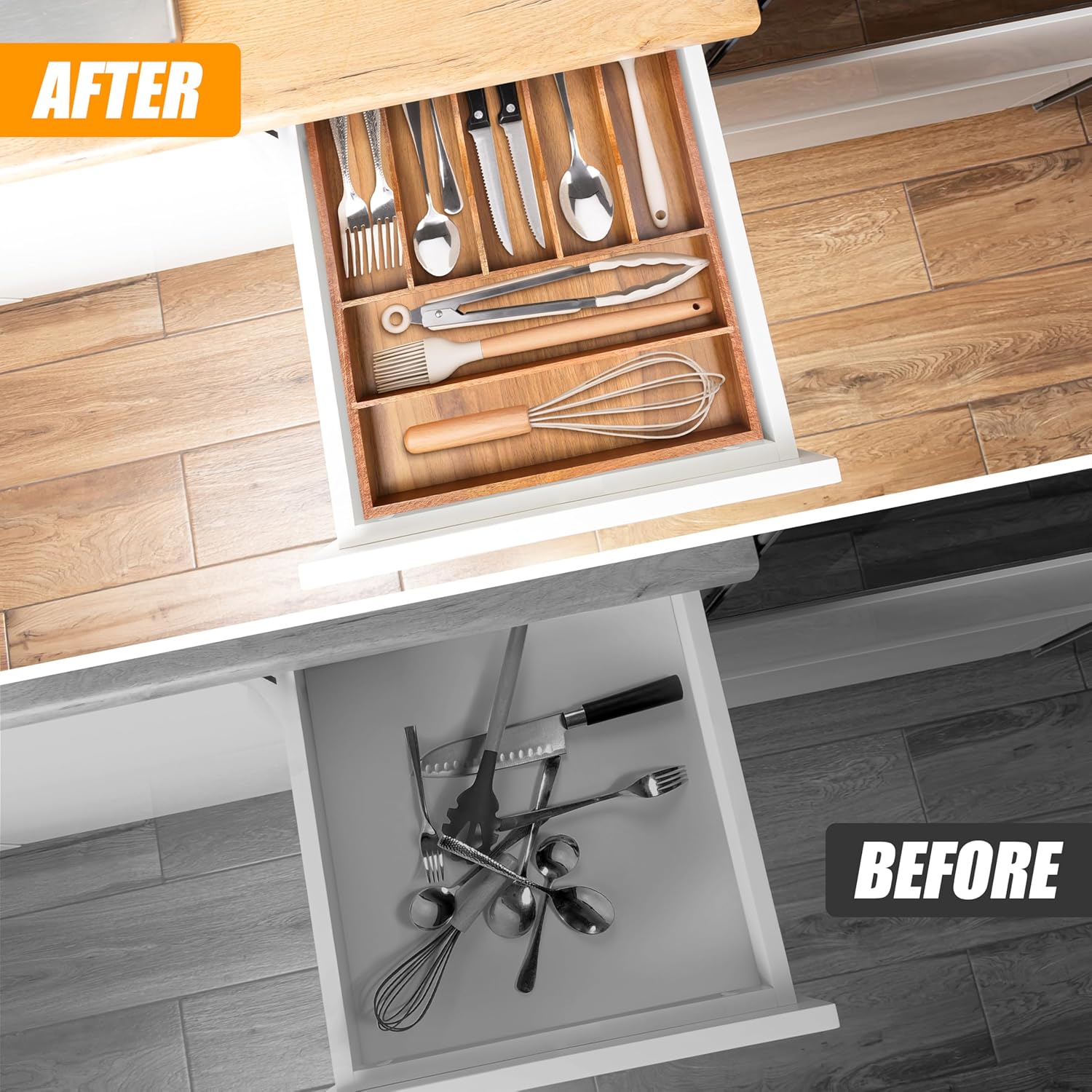 - ✅【Deep Compartments & Reinforced Base】Our utensil drawer organizer features compartments with a depth of 1.9 inches, helping maximize drawer space and perfect for storing more essential tools and gadgets. The utensil silverware drawer organizer flatware cutlery tray comes with a reinforced base, ensuring durability for long-term use, and is ideal for supporting the weight of heavy-duty utensils and knives. Keep everything you need conveniently at hand while cooking, neatly visible, and easy to grasp when preparing the next meal in the kitchen.