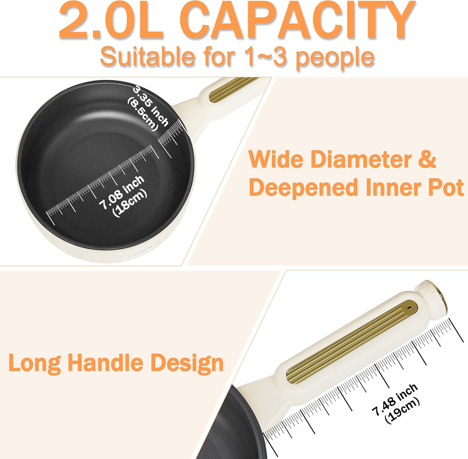 - 【2L Capacity Electric Pot】 This electric cooking pot has a 2-liter capacity, with an inner diameter of 7.08 inches and a depth of 3.35 inches, making it ideal for frying, sautéing, braising, stir-frying, and cooking. With the extended handle design measuring 7.48 inches long, it ensures a more comfortable grip and easy use, also reducing the effort required for handling and making it more labor-saving.