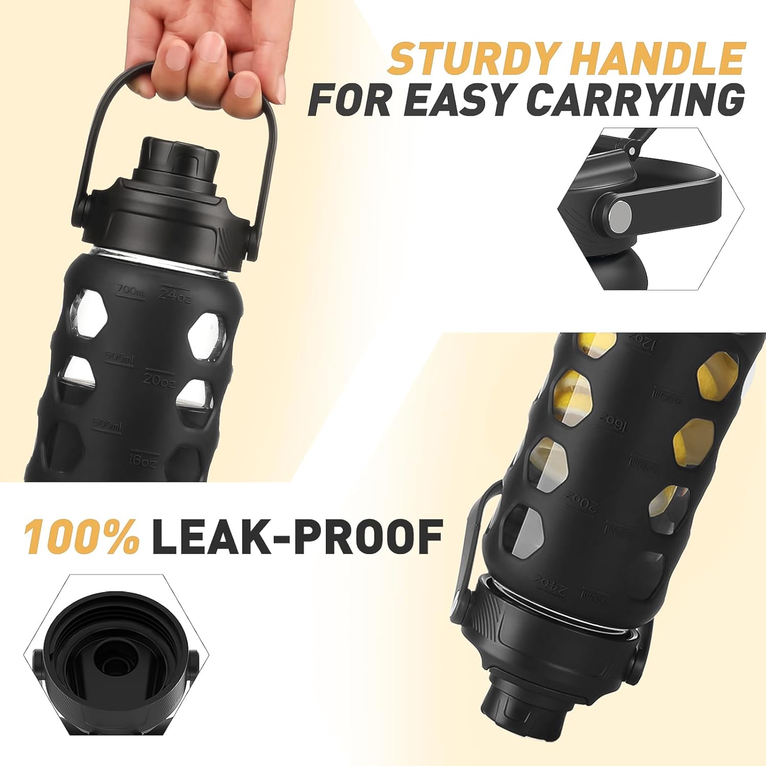 MUKOKO Glass Water Bottles, 24oz Glass Tumbler with Straw, Drinking Bottles with 2 Lids-Handle Spout Lid&Bamboo Straw Lid, Motivational Water Bottle with Time Marker and Silicone Sleeve, 1 Pack-Black