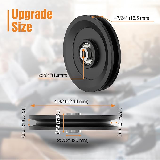 - Upgraded Size: Upgraded Size: Nylon pulley wheel diameter 114 mm(4.5 inches), Bolt Bore: 10 mm(0.39 inches), Groove Depth: 9 mm(0.35 inches). This is an upgraded pulley and the increased diameter makes it a breeze to lift heavy objects
