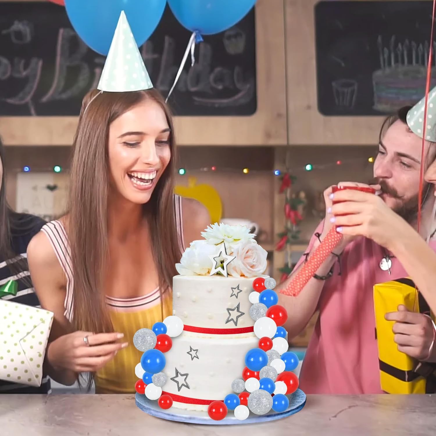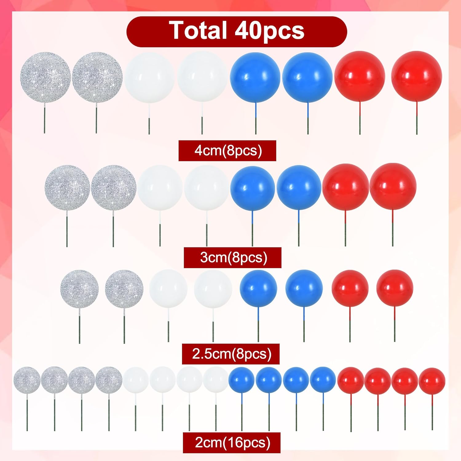 BEISHIDA 40 Pcs Foam Ball Cake Toppers with Sticks Mini Cake Decorations for Birthdays, Weddings, Baby Showers, DIY Baking Supplies, Anniversary Party (Red, Blue, White,Silver)