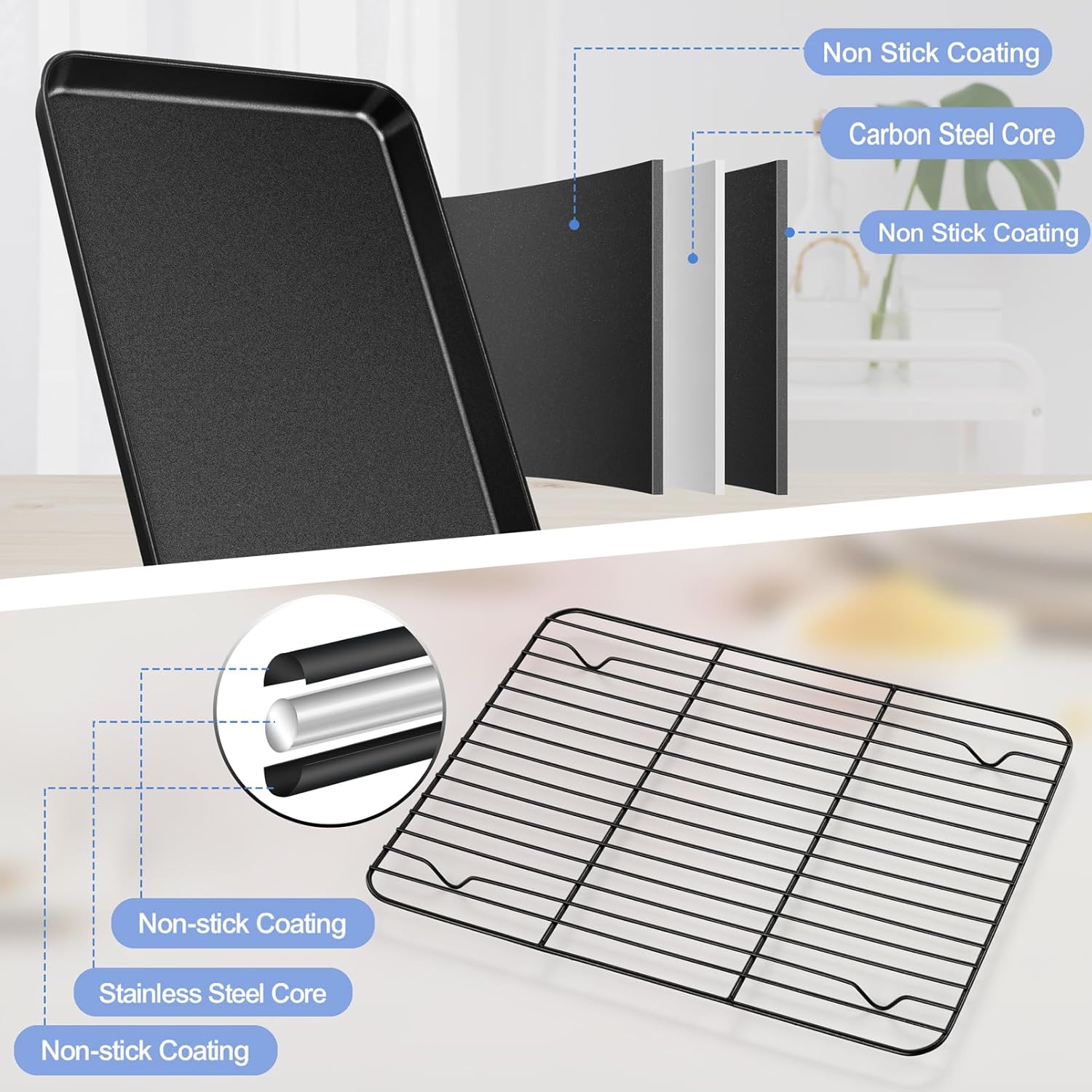 - HEALTHY & STURDY: Toaster oven tray is crafted from heavy-duty carbon steel, Cooling rack is made of pure stainless steel, Both pan and rack are coated with black food-grade non-stick coating, No harmful substance release into your foods, With thick gauge and sturdy construction for using longer time