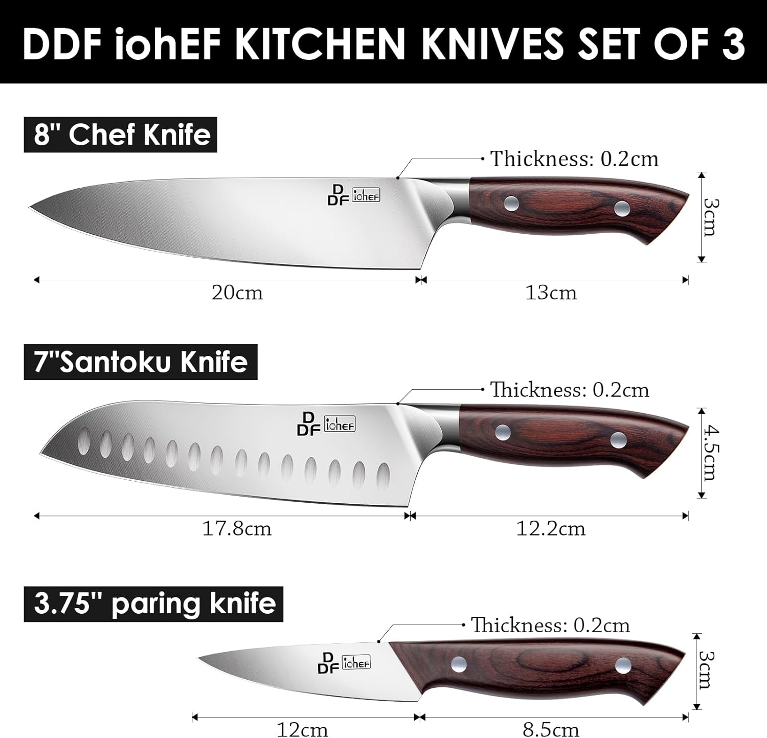- 【MULTI-PURPOSE KITCHEN KNIFE SET】: DDF iohEF 3 PCS kitchen knife set includes ultra sharp 8" Chef Knife, 7" Santoku Knife, 3.75" Paring Knife. This knife set can be used for your daily kitchen tasks and fit all your needs.