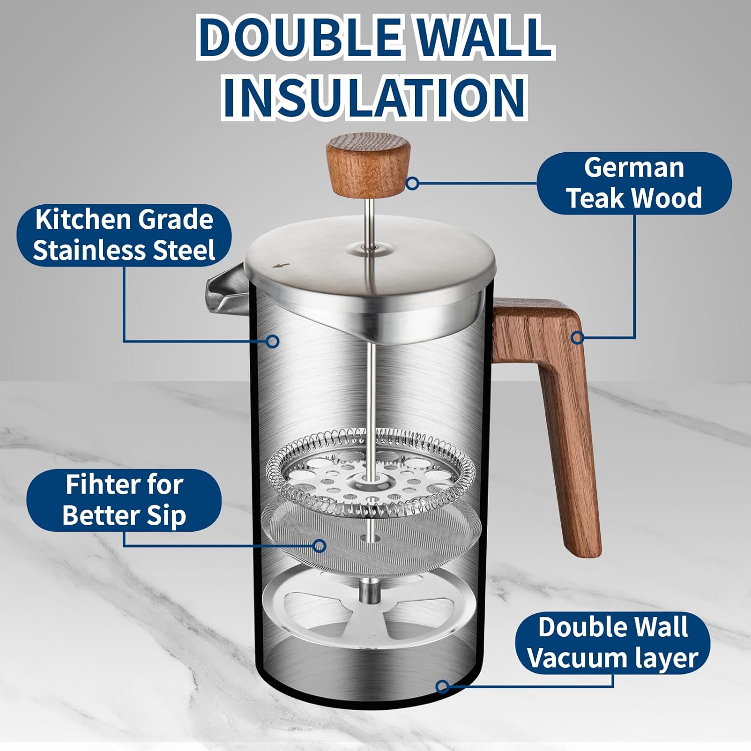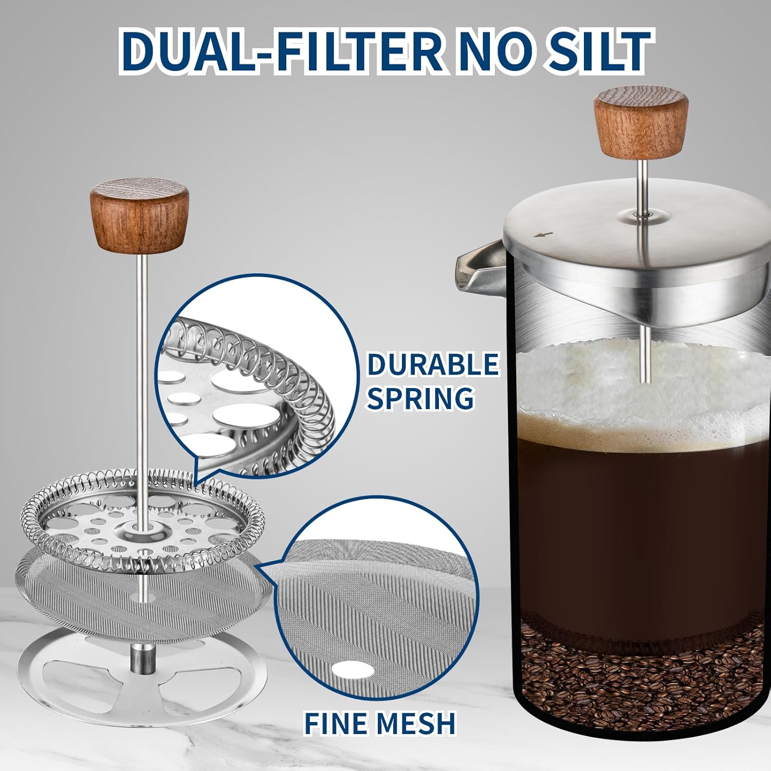 BERTILLE french press coffee maker, 34OZ 304 food stainless steel French press coffee maker with solid wood handle, double-layer insulation and 3-layer filtration system (silver)