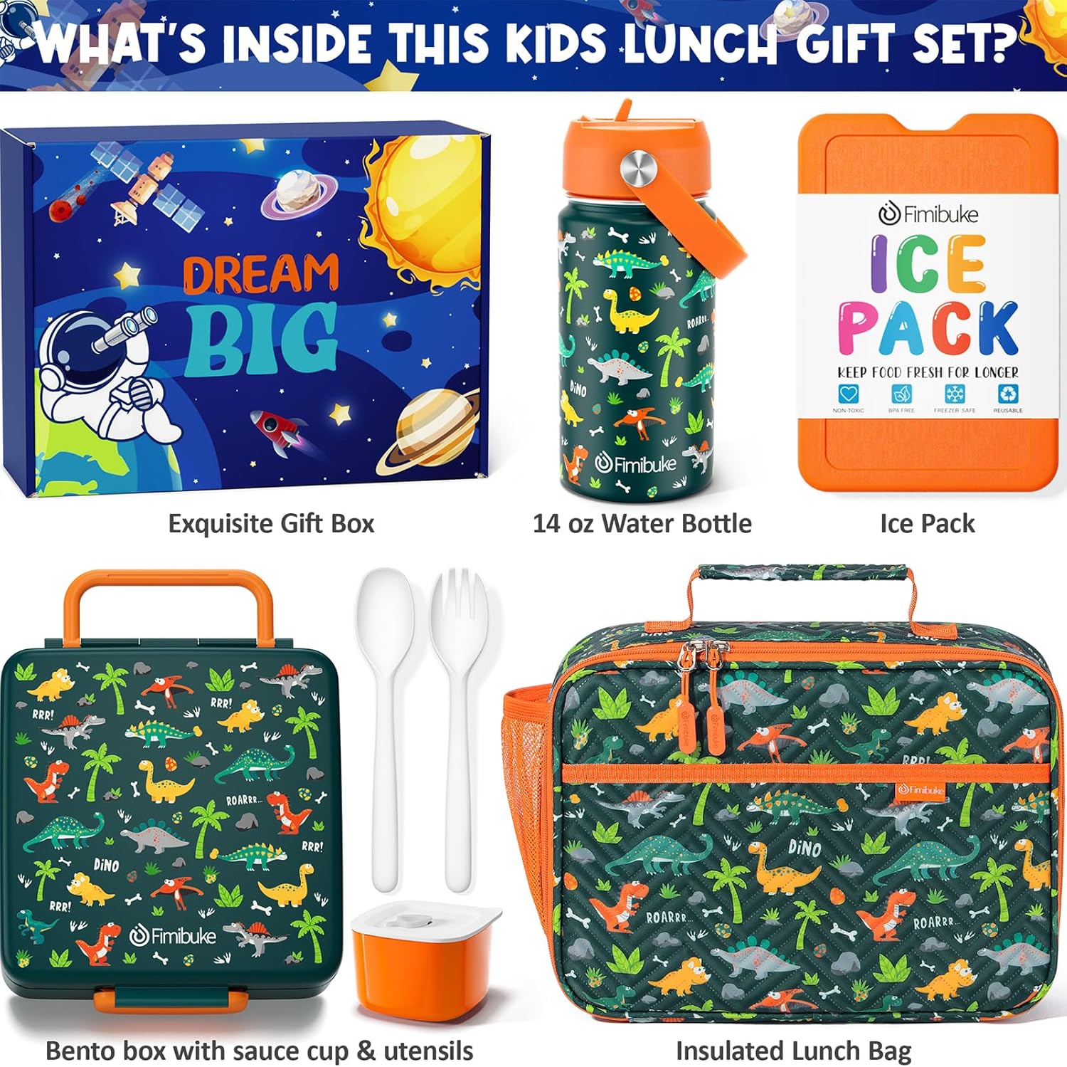 - 7PCS KIDS SCHOOL LUNCH BOX GIFT SET: Fimibuke kids lunch box set provides an one-stop solution for kids school lunch or snacks packing and carrying, this all combined gifts box comes with a 100% leak-proof bento box, a 14oz water bottle insulated, a kids insulated lunch bag, an ice pack, a sauce jar, a set of utensils and an exquisite gift box. Perfect for ages 3-12 kids to daycare, nursery school, preschool, kindergarten, elementary school, back to school or summer camp with a healthy lunch
