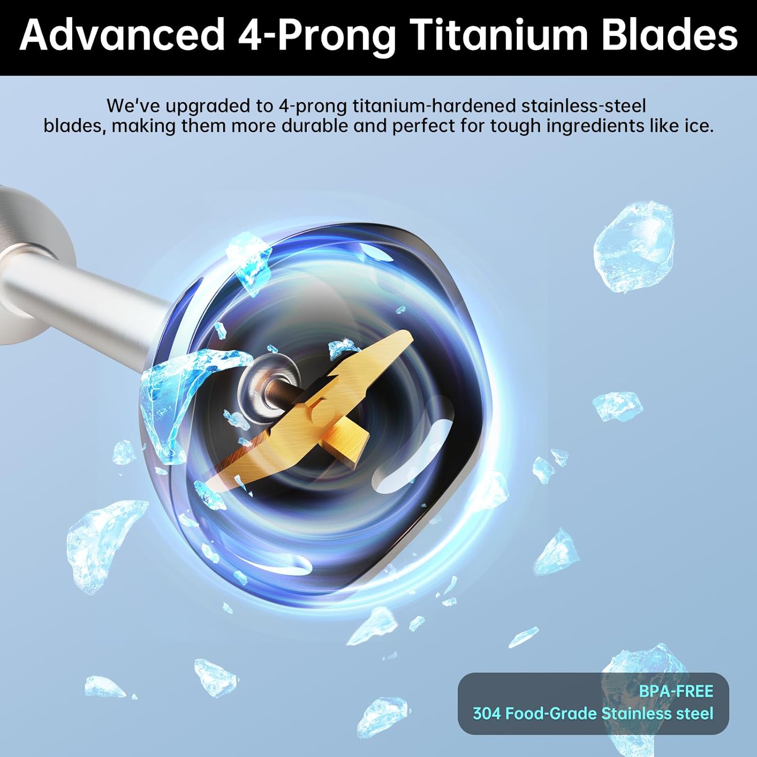 - HIGH POWER & UNIQUE BLADES ENSURE CONSISTENT SMOOTH RESULTS: Smoothies taste better when adding ice cubes and frozen fruits. That's why our immersion blender has distinctive 4-prong Titanium steel blades with a curve design and a powerful 1000-watt motor to help blend hard ingredients and deliver consistently smooth results.
