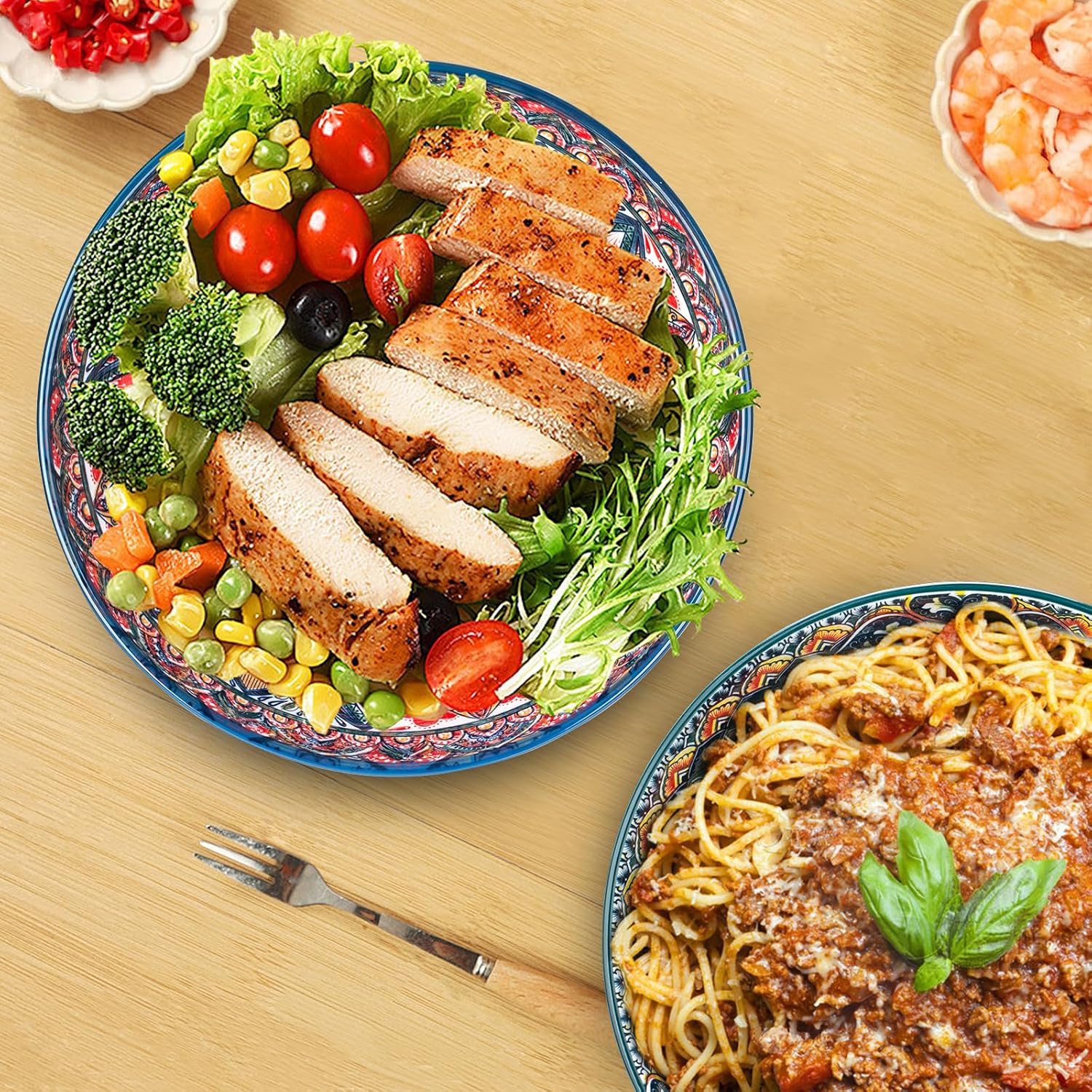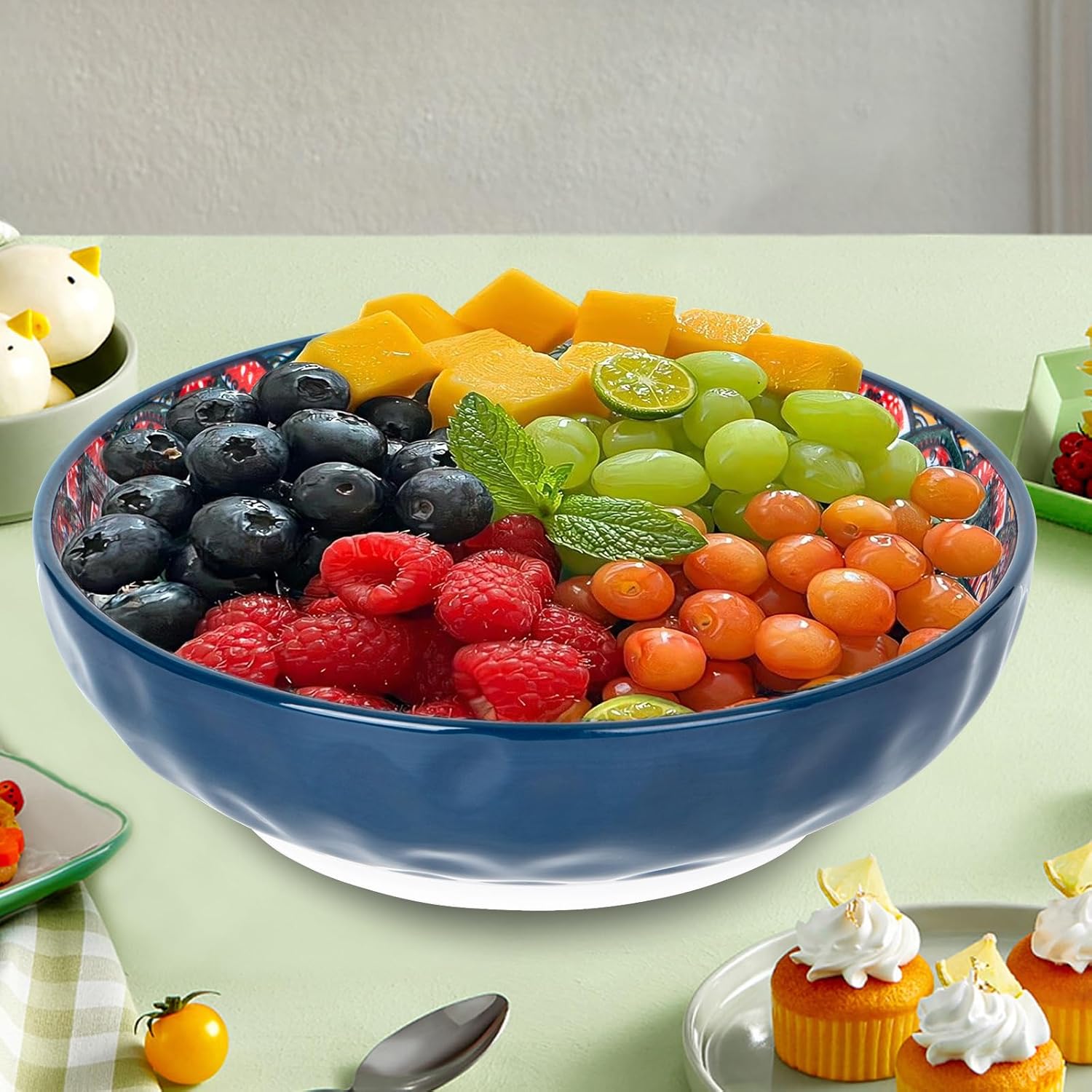 75 Oz Serving Bowls,Bohemian Style Large Porcelain Dishes for Entertaining Parties,Big Bowls for Eating Soup, Salad, Pasta, Fruit, Chips, 10.3 Inch Diameter (blue blue)