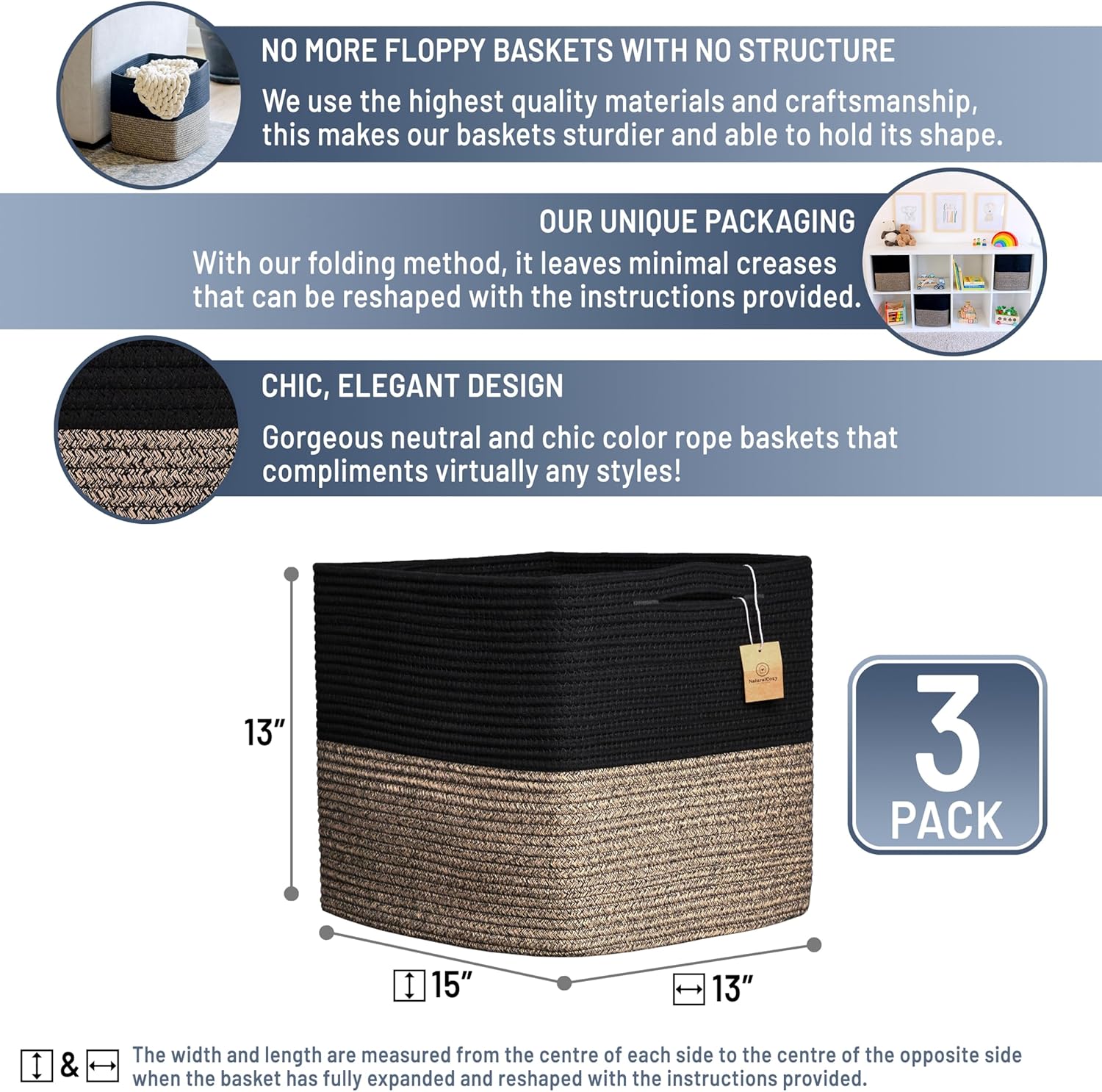 NaturalCozy 13x15x13 Kallax Storage Cubes Bins, 3 Pack | Cotton Rope Cube Storage Bin Woven Baskets for Organizing | Kallax Insert Storage Baskets for Shelves Organizer, Kids Toy, Closet Baby Nursery