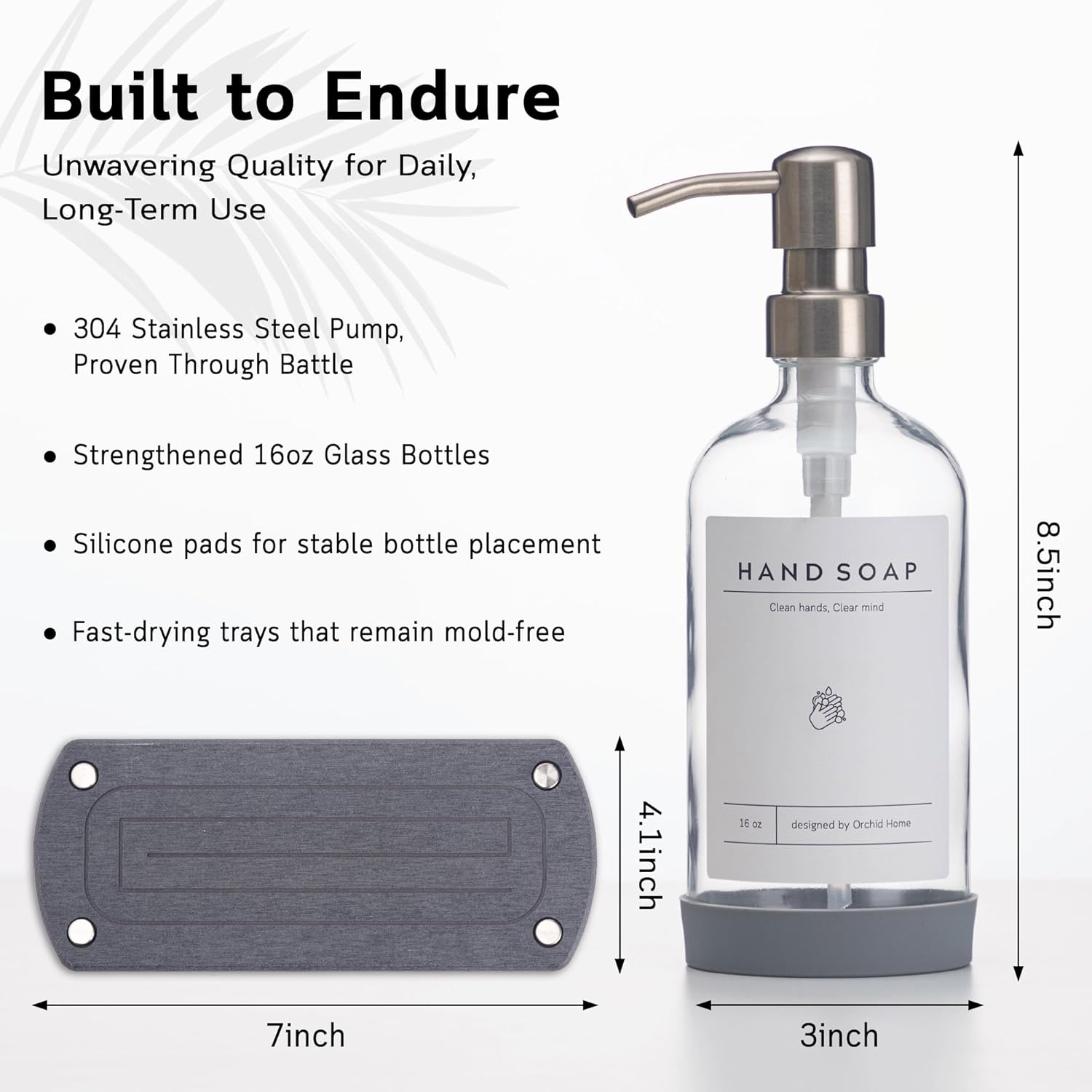 - LUXURY SOAP DISPENSER SET: Elevate the look and feel of your kitchen or bathroom with our luxurious kitchen soap dispenser set. This set includes two transparent glass bottles with sleek silver stainless steel pump heads, two gray silicone bottom anti-slip pads, a dish brush, a brush holder, and a quick-drying diatomaceous earth tray. Experience a modern and elegant upgrade with this stylish set for your daily soap needs