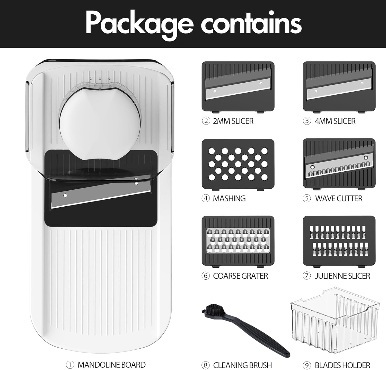 - Smart Designed : Safety lock design can better protect your fingers. knife holder boxes can storage blades, saving more kitchen space. Non-slip bottom ring keep the whole food slicer sturdy while maintaining better stability