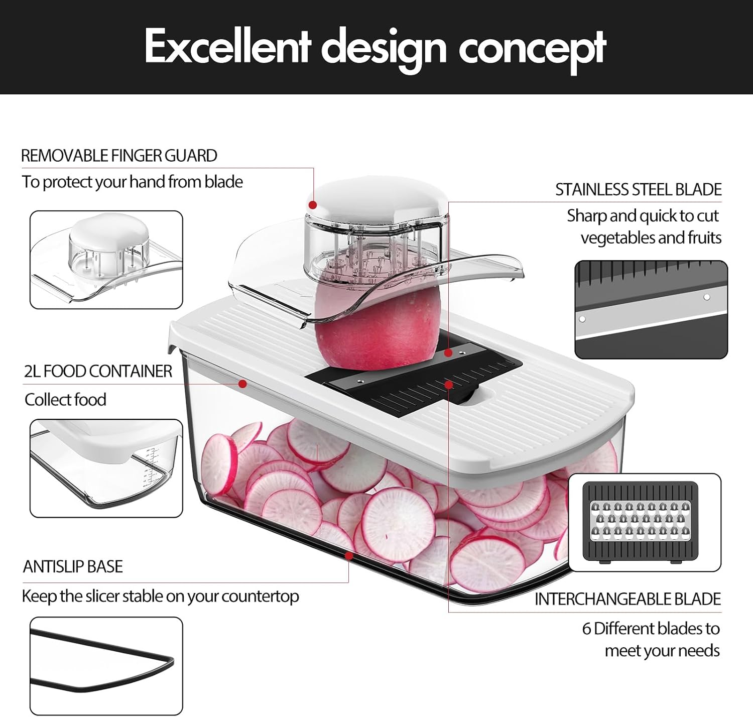 Cambom Mandoline Slicer Vegetable Slicer With 2 L Container for Potatoes, Tomatoes, Cucumbers, Carrots With 10 Blades White