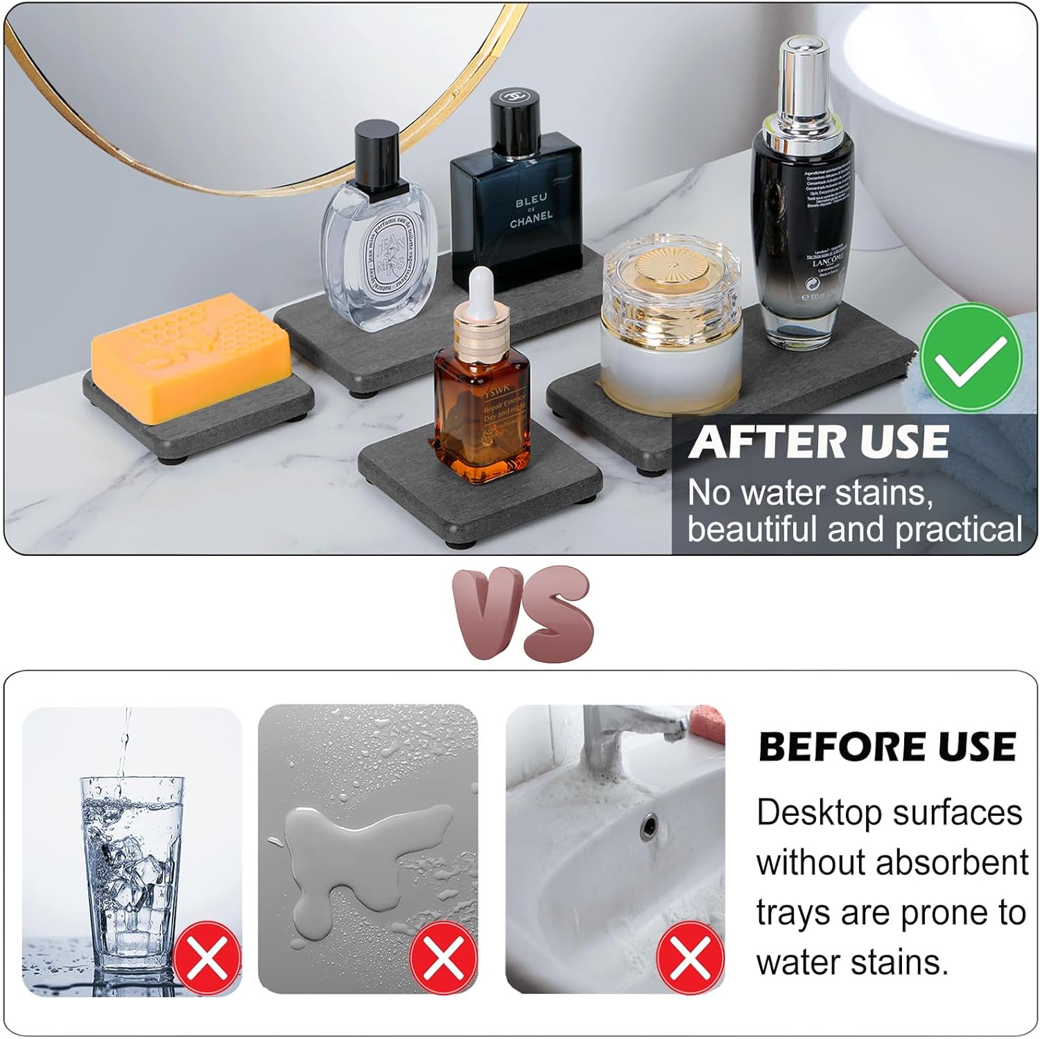 - More Anti Slip and Ventilated --- The silicone footpads boost the slip-resistance of absorbent stone coasters while keeping them out of the bathroom vanity. This design improves the contact surface between diatomaceous earth coasters and air, accelerates the evaporation of water, and extends the service life of the water absorbing stone tray for sink.