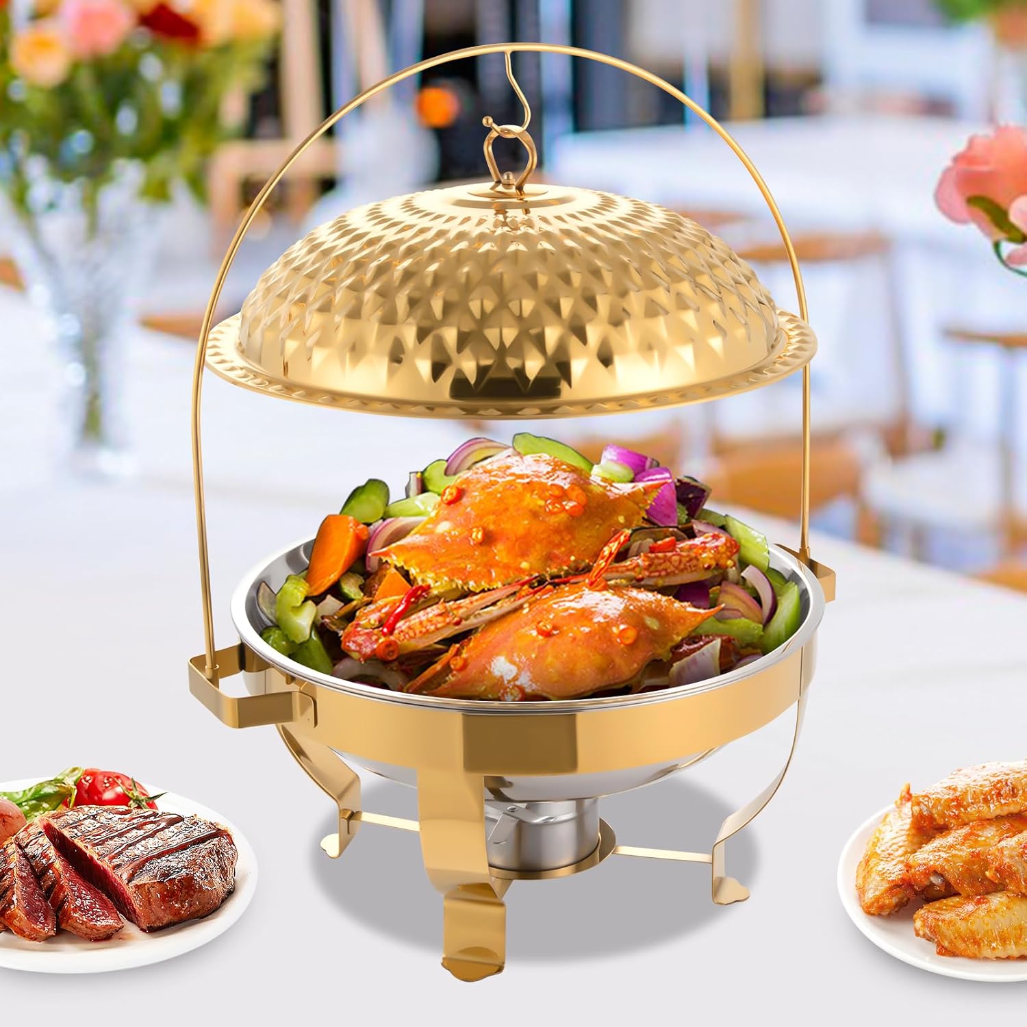 Chafing Dish Buffet Set, Stainless Steel Hanging Lid Dining Stove, Roll Top Chafing Dish Buffet Diamond-Shaped Lid and Round Stand for Buffet Restaurants and Banquets (Gold, 8L/8.5QT)
