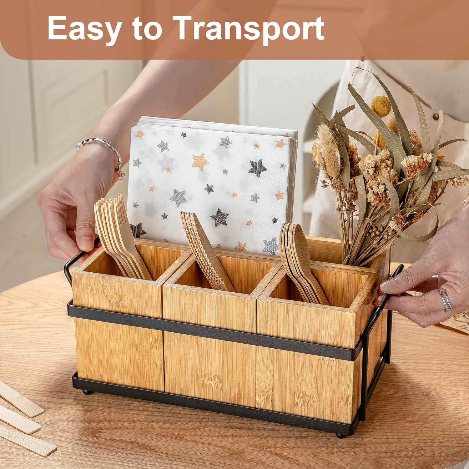 - Silverware Holder:The utensil caddy 4 in 1 has four removable square wood slots which can be used to organize 8" paper plates , napkins,spoons, forks, and knives. With the black metal handles,you can be easy to carry it.Durable and easy to move