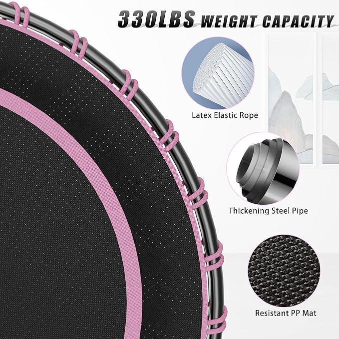 - ✅【Max Load Bungees】:Gielmiy fitness trampoline replaces the rigid, squeaky metal springs with super-elastic bungee rope,Our 30 bungee ball cords have high elasticity,Thicker bungee material is 0.32"(8MM) in diameter, offering better strength in Gielmiy fitness trampoline,reduces noise in maximum extent, affords more stability, and gives you a great jumping experience.user up to 330 pounds(150kg).