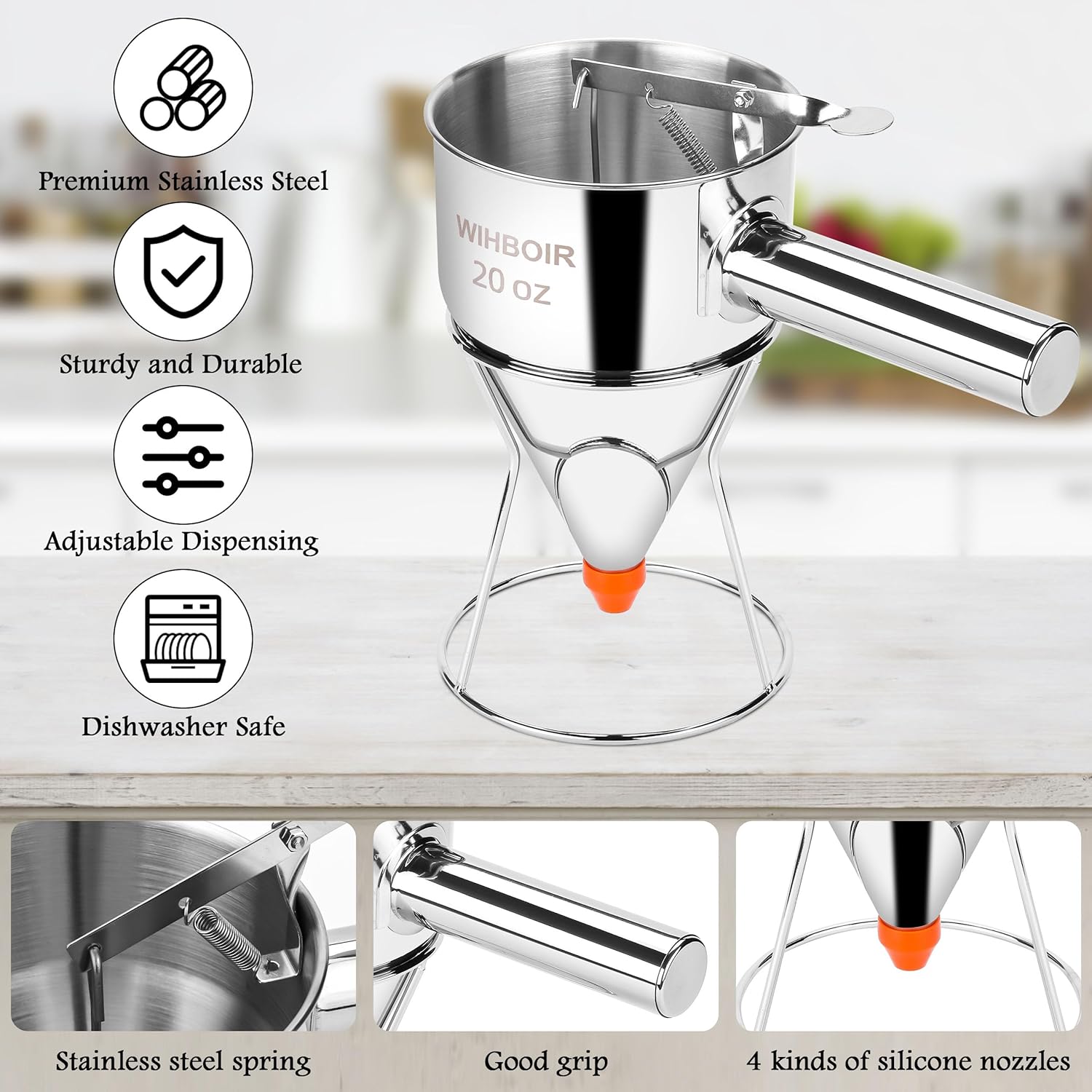 - Effortless Cleaning: This metal pancake batter dispenser is crafted from high-quality stainless steel, including the spring. It is dishwasher-safe or can be quickly cleaned by hand.