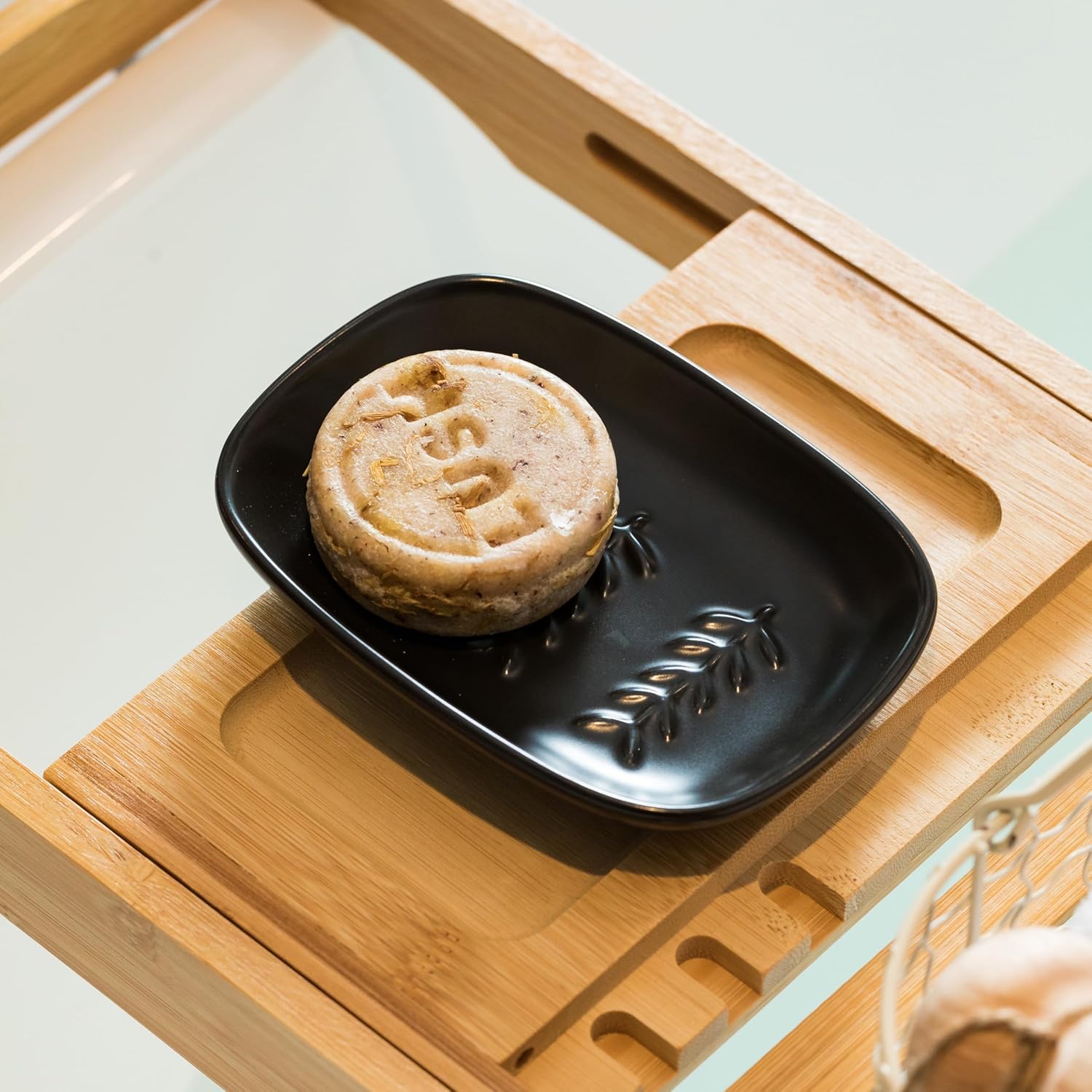 Soap Dish Soap Holder Shower, Ceramic Soap Dishes for Bar Soap Sponge, Shower Saver Tray for Bathroom Kitchen Sink, Raised Leaf Design, Black