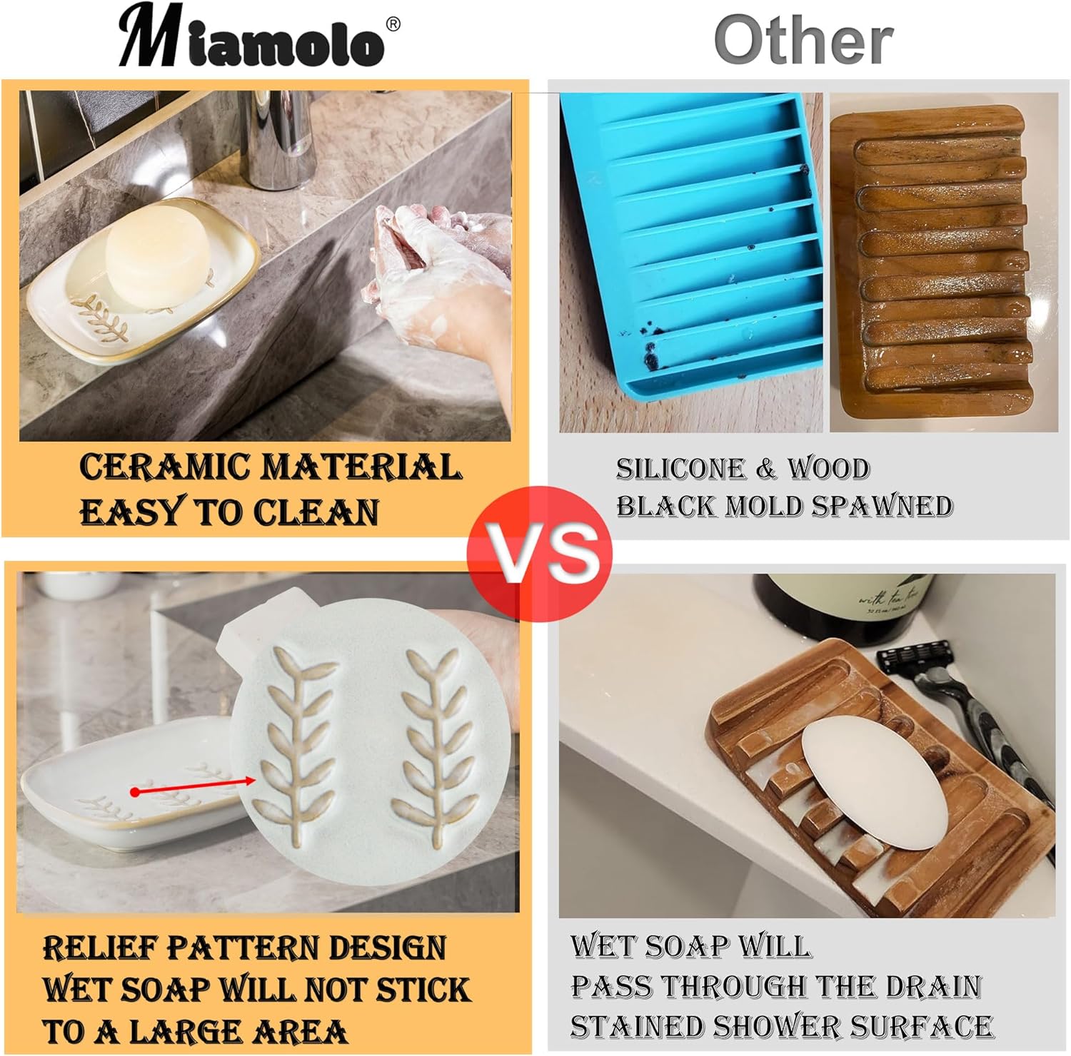- PREMIUM QUALITY MATERIAL: Miamolo Soap Dish is made of high quality ceramic material, durable and non-slip, ensuring that the soap is securely placed and will not slip off. It stays stable even in humid environments