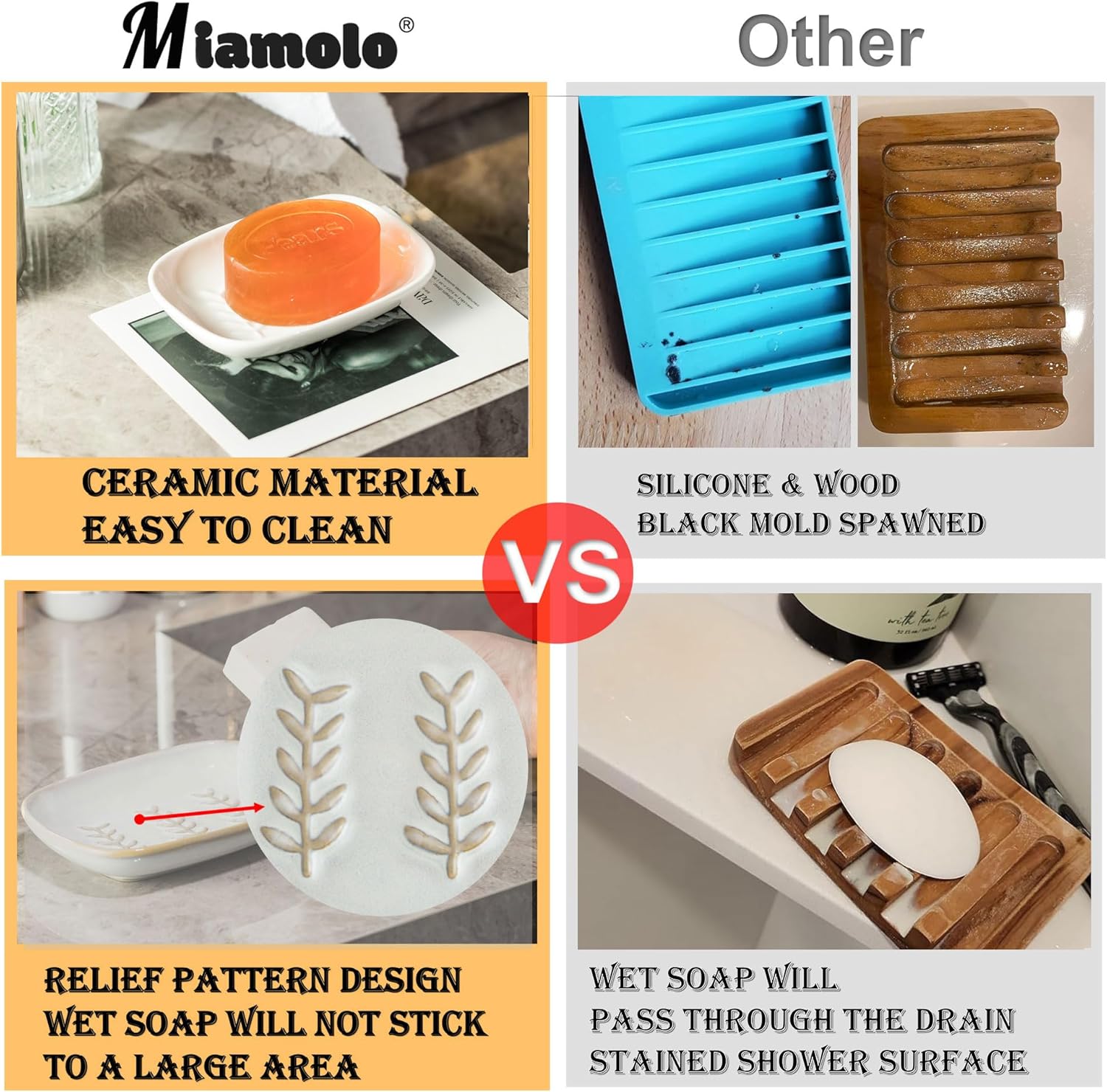- PREMIUM QUALITY MATERIAL: Miamolo Soap Dish is made of high quality ceramic material, durable and non-slip, ensuring that the soap is securely placed and will not slip off. It stays stable even in humid environments