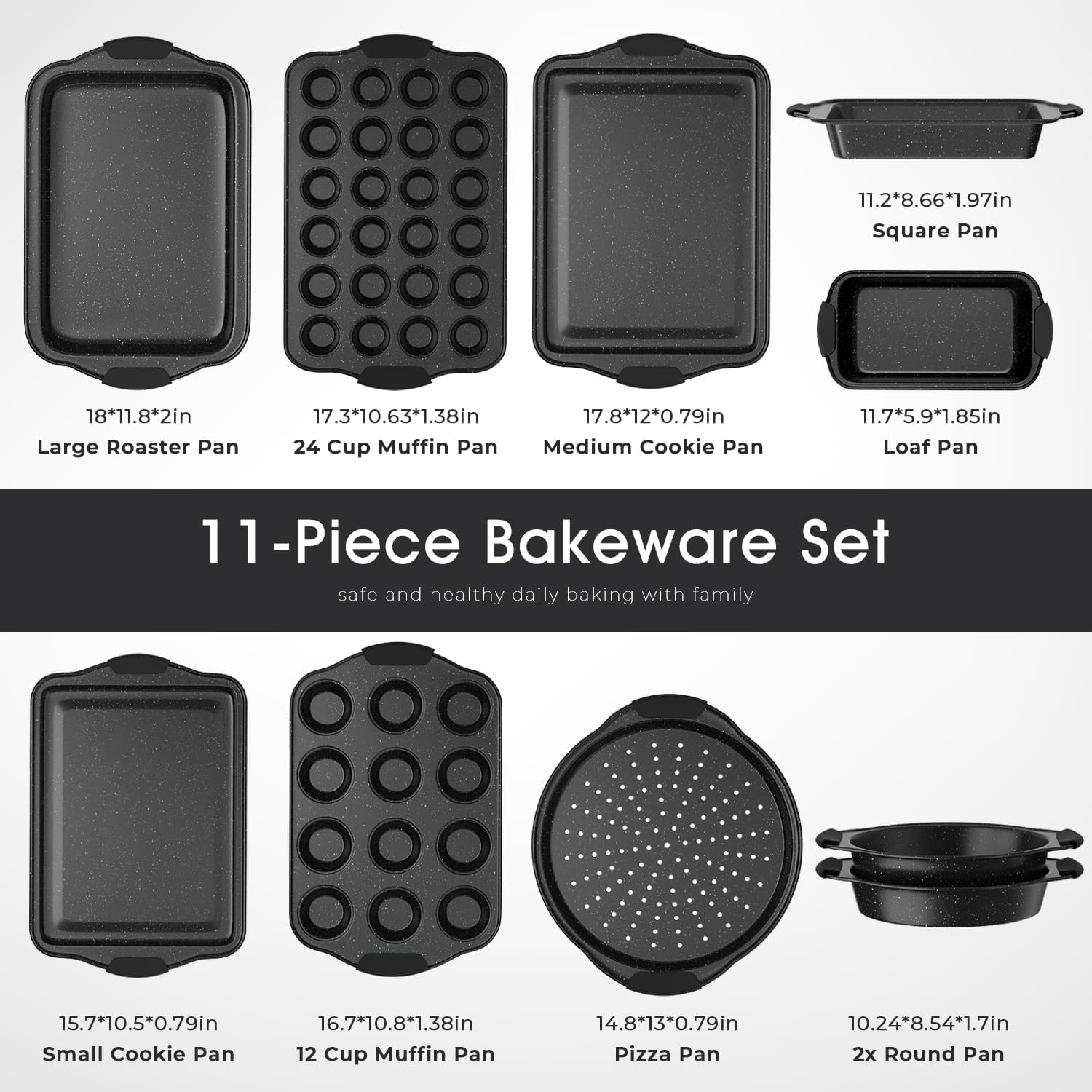 11-Piece Nonstick Baking Pan Set, Stackable Bakeware Sets, Oven Pans for Baking with Silicone Handles, Includes Cookie Sheet, Cake Pans, Loaf Pan, Pizza Pan, Muffin Pan, Black