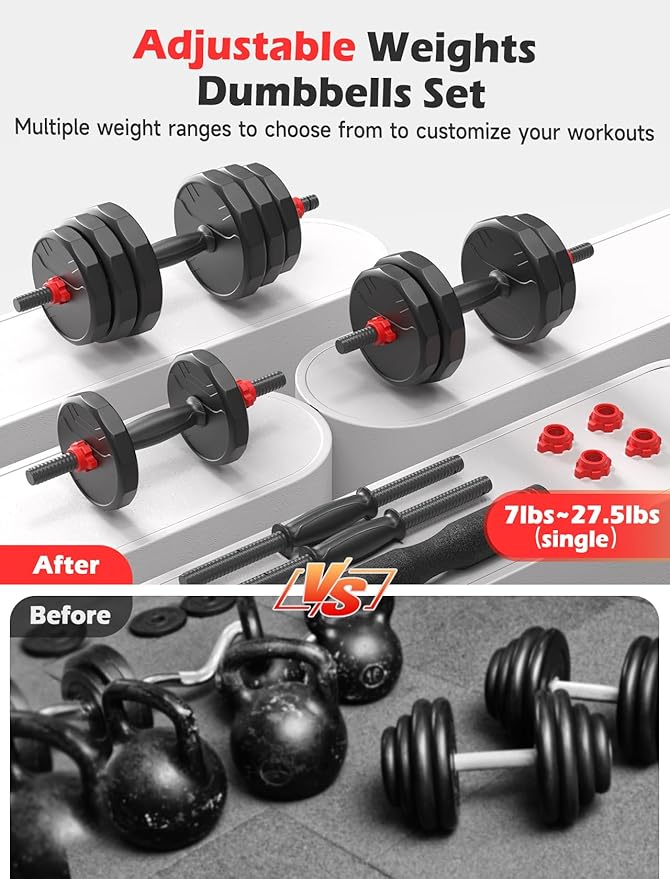 - Quick and Easy Adjustments: This adjustable dumbbell set allows for quick and easy weight changes, with a single dumbbell's adjustable weight range from 7lbs to 27.5lbs. The detachable design makes weight adjustments simple, ensuring you can switch between different exercises seamlessly, from light workouts to intense training sessions.