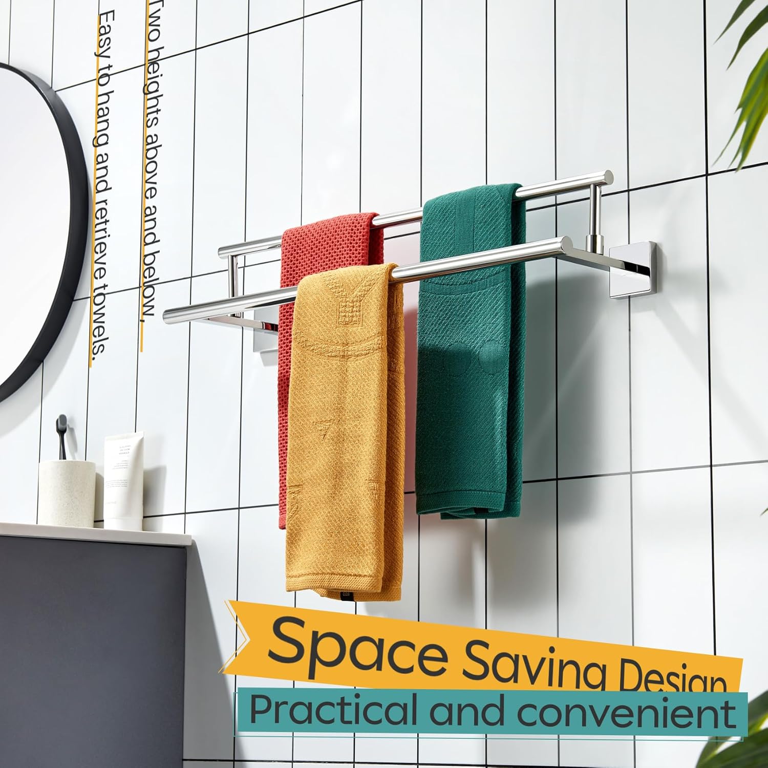 - ◄ MODERN DESIGN ► KOKOSIRI double towel rack with two rails combines elegant square, sleek round, and unique rectangle elements to bring a modern aesthetic to your bathroom, shower room, toilet, kitchen, washroom, pool or garage. You can choose from our series of bathroom hardware for a complete, coordinated look to your place