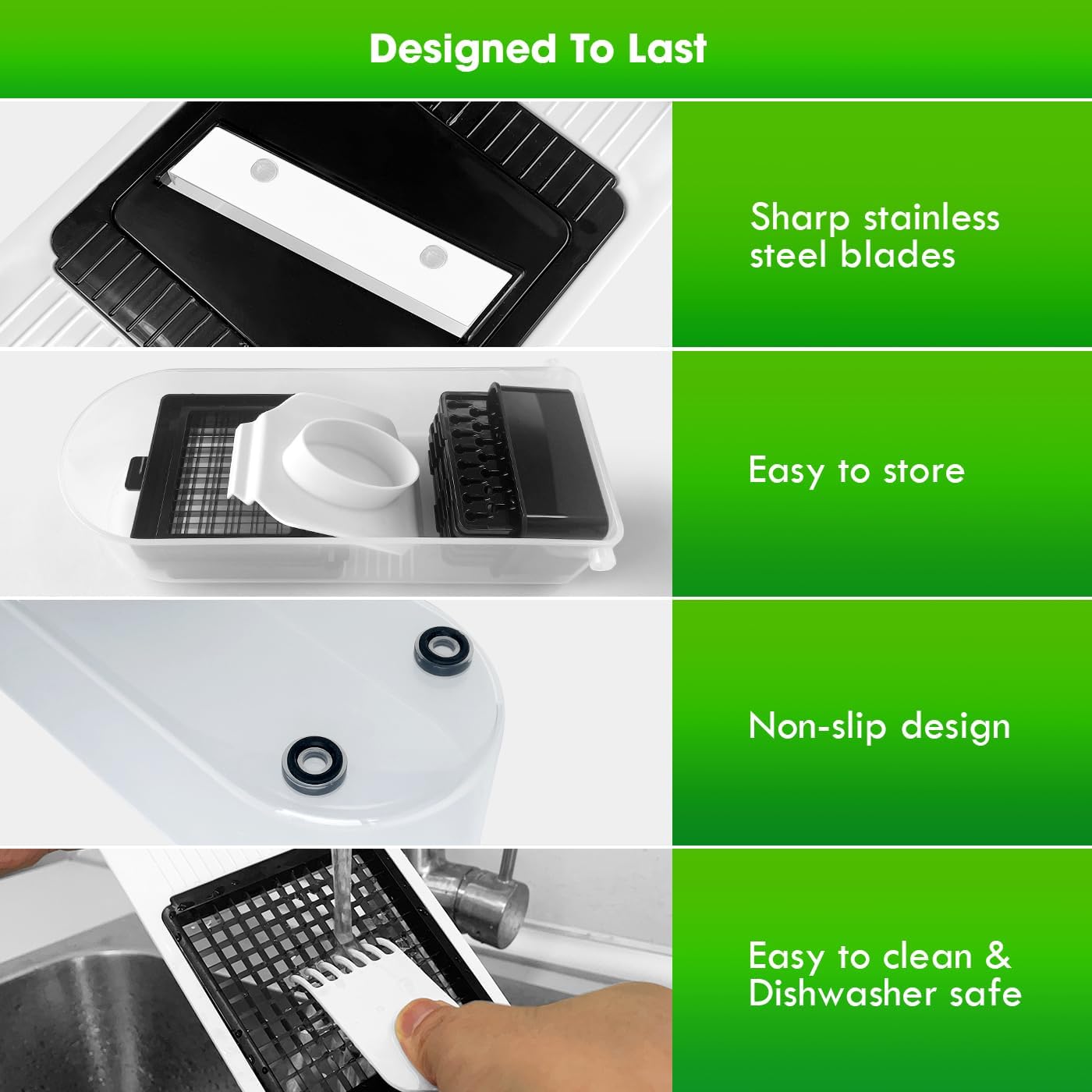 - Easy to clean, dishwasher-safe - Choosing the right kitchen kools makes your life easier - our vegetable slicers, dicer, shredders are quick and easy to clean, and dishwasher-safe. The top cover is completely removable, can be thoroughly cleaned under running water, and comes with two cleaning brushes. Easily solve your kitchen chores.