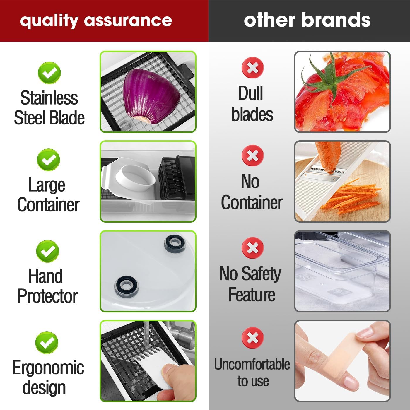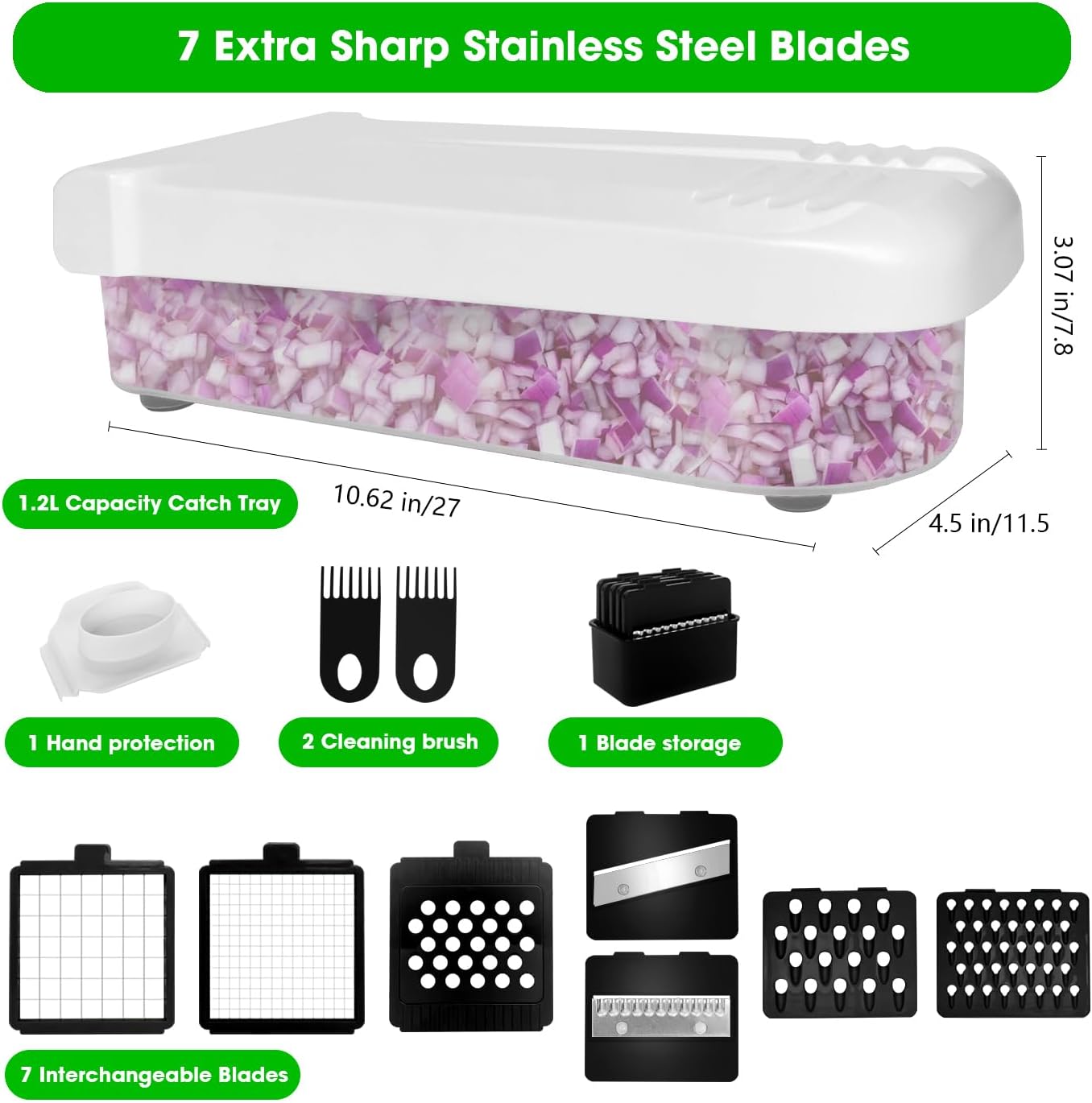 - High quality & great value - The Vegetable chopper has the function of mandolin slicer and cheese grater, and excellent quality. It includes 7 blades, 2 cleaning brush, 1 finger guard, and a 1.2L container for safe and efficient meal prepping.