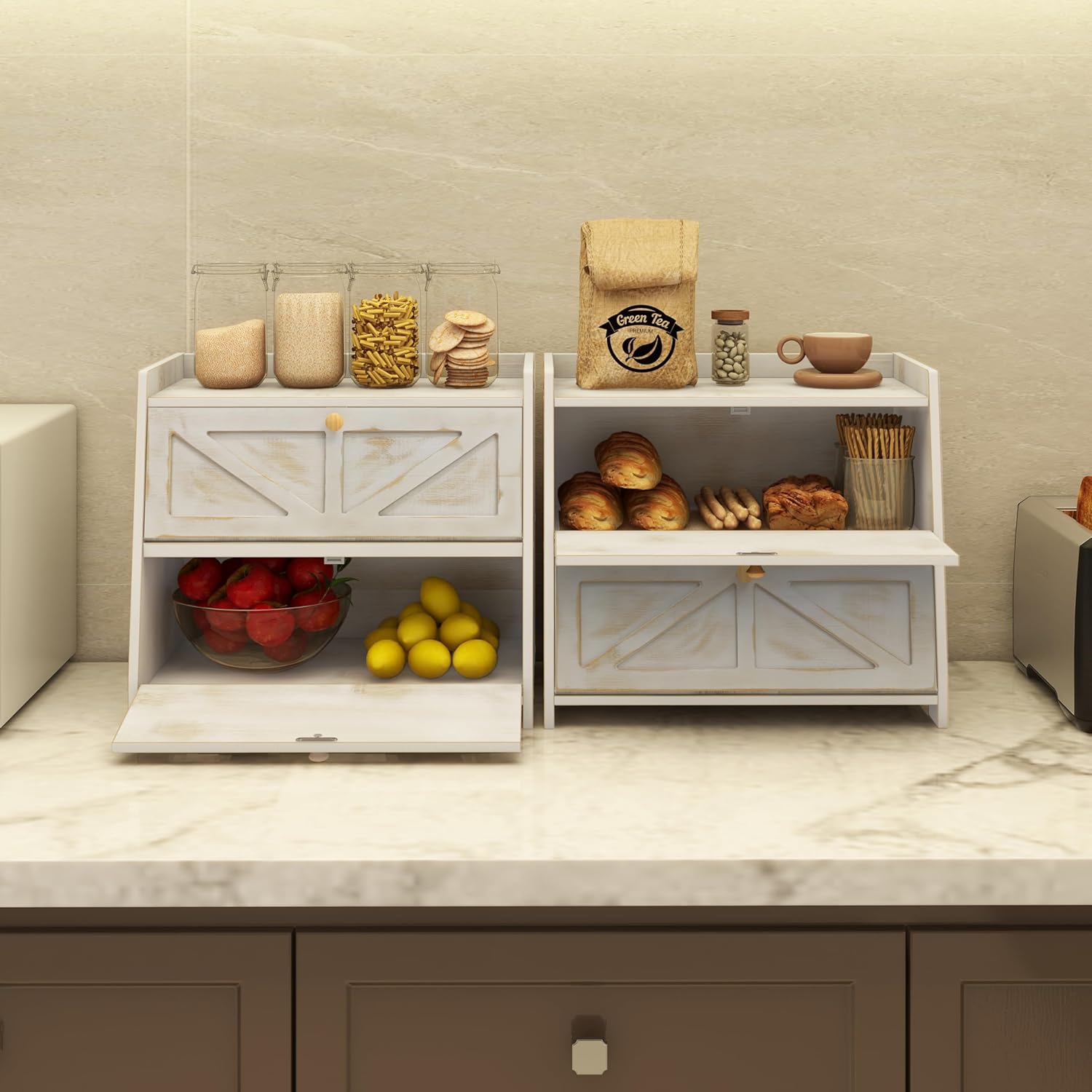 Vintage Double Layer Bread Box for Kitchen Counter Bamboo Bread Storage Container Large Capacity Bread Storage Bin (Antique White)