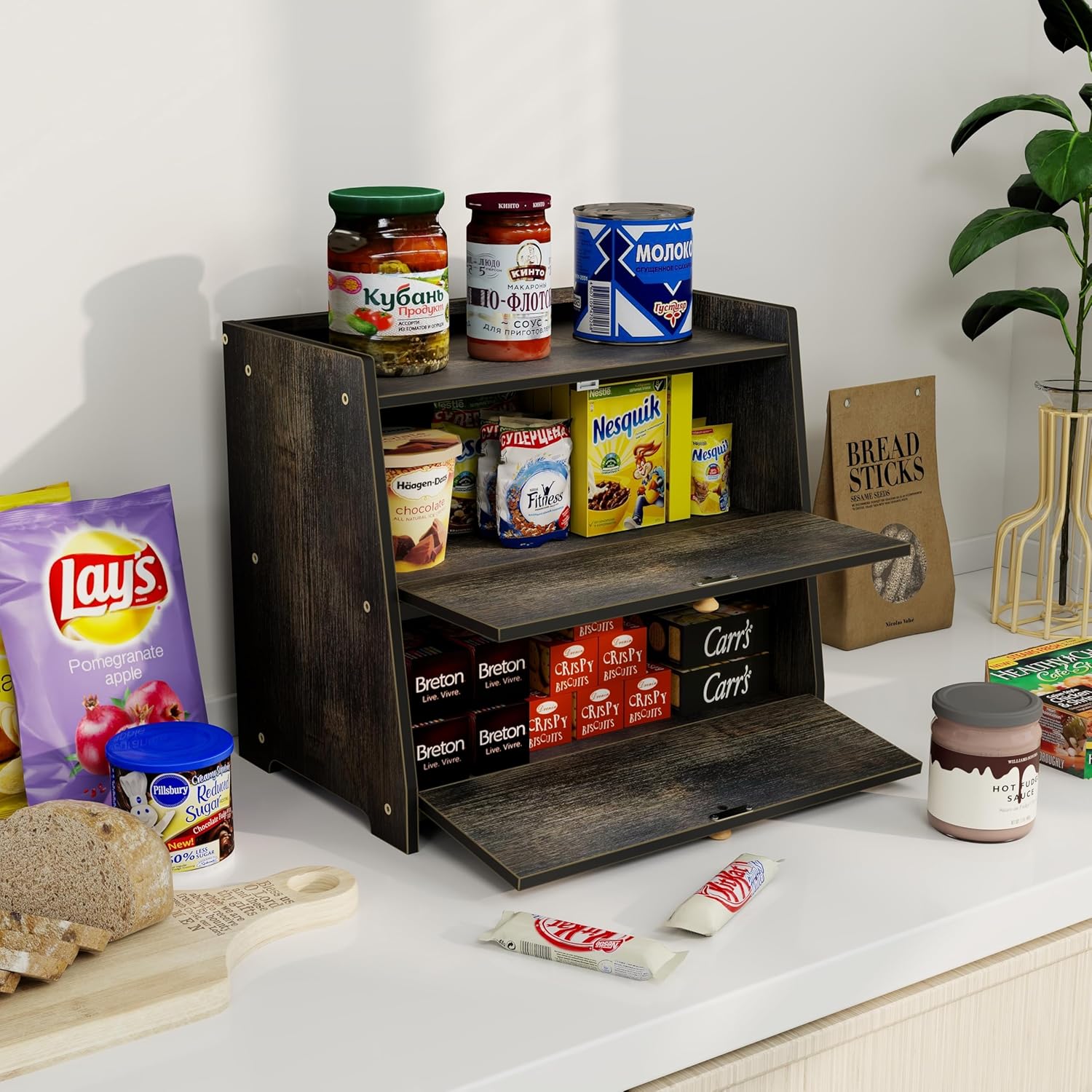 Vintage Double Layer Bread Box for Kitchen Counter Bamboo Bread Storage Container Large Capacity Bread Storage Bin (Antique Black)