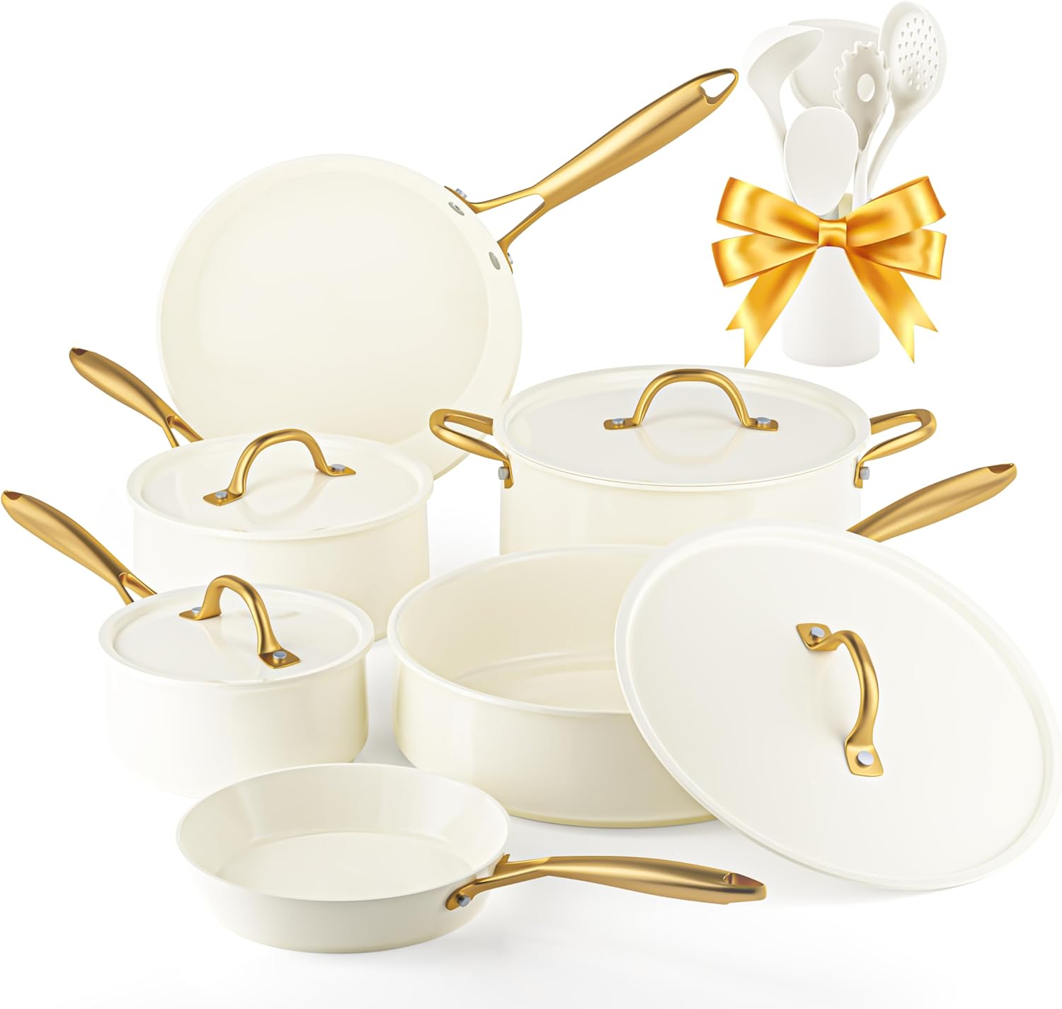 - NATURALLY NONSTICK: No more sticky or difficult-to-clean problems. The ceramic cookware set requires less oil or butter for cooking and minimal scrubbing for a spotlessly clean.