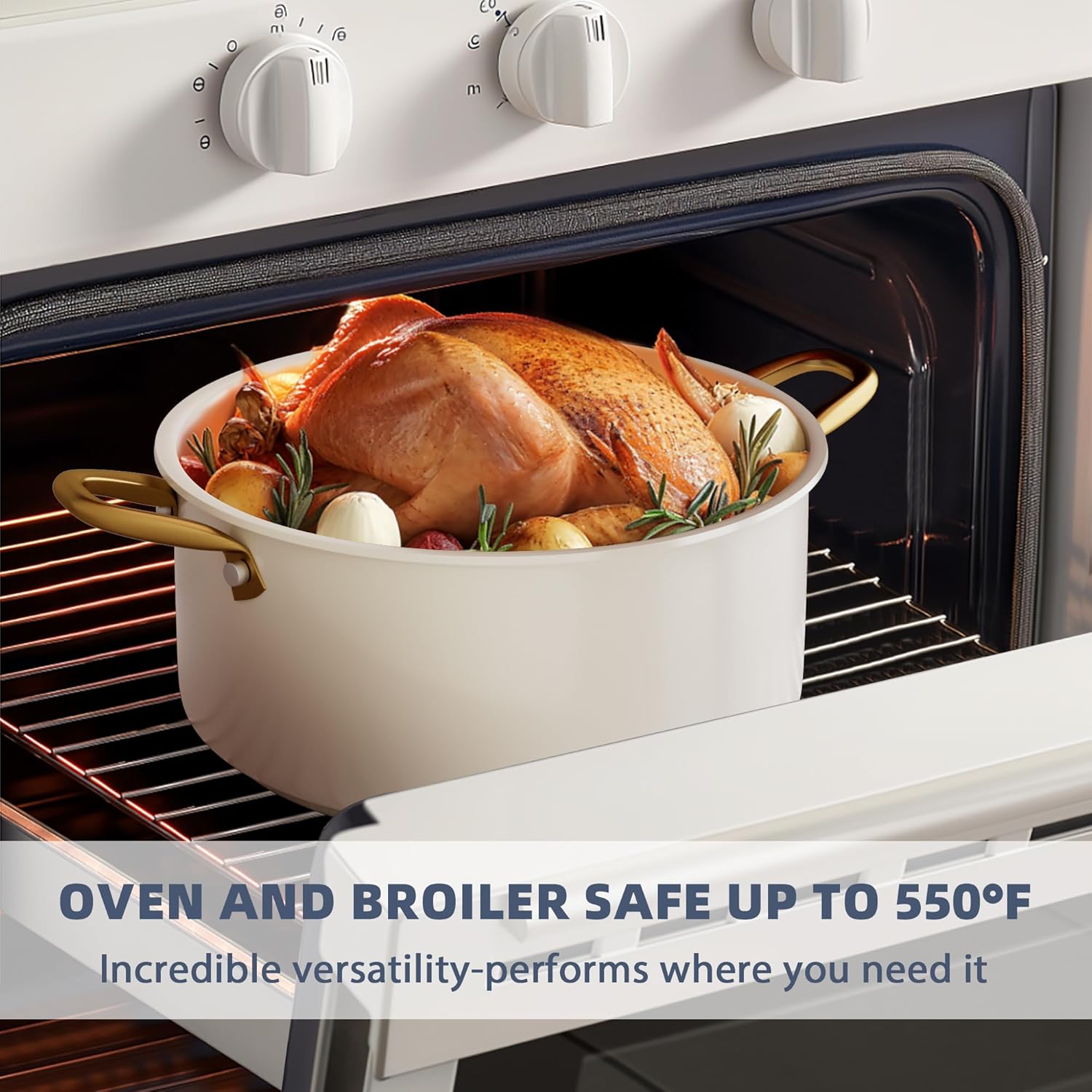 - FOR ALL STOVETOP & OVEN SAFE: The innovative induction base delivers uniform heat distribution on all cooktops, induction, gas, electric, halogen or ceramic. Plus, oven safe up to 550°F, making the non stick pots and pan set great for bread baking and roasts.