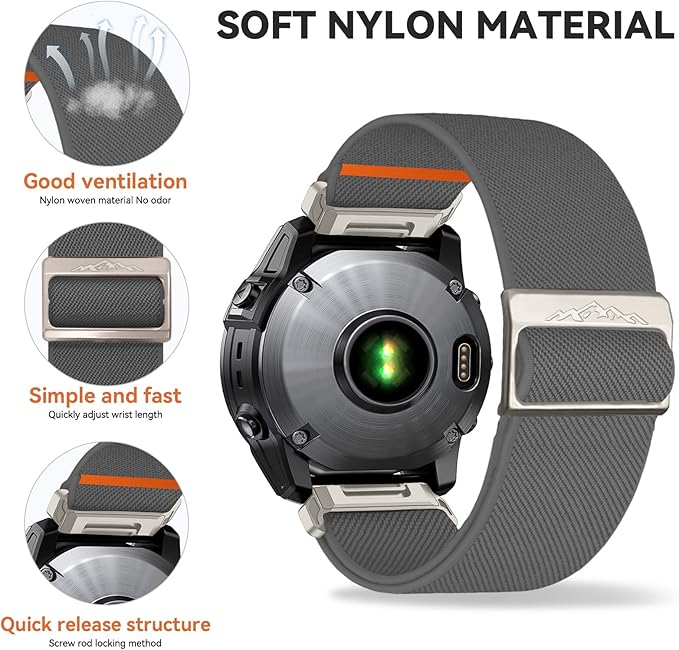 - 【User-Friendly Material】Compatible with Garmin Fenix 6x/Fenix 5x/Fenix 7x bands elastic nylon braided strap is made of high quality stretchy nylon, super soft and lightweight, breathable and comfortable. This eco-friendly nylon and the sweat-absorbing property make this strap super skin-friendly.